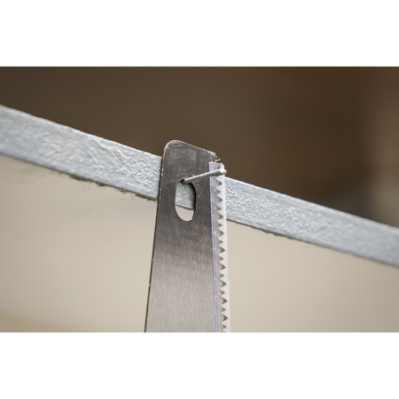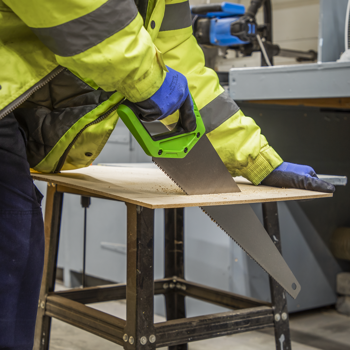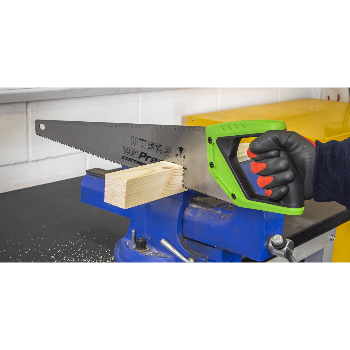 ABS and TPR anti-slip soft grip handle with finger rest for comfort and control. 1mm 65Mn High grade carbon steel blade. Hardened and tempered double ground teeth for fast and efficient cutting. Lacquered coating for reduced friction and corrosion resistance. 45° and 90° angle guides integrated into handle with useful ruler markings along top edge of blade. General purpose 7tpi blade suitable for timber, hardwood, MDF, chipboard and plastics.
