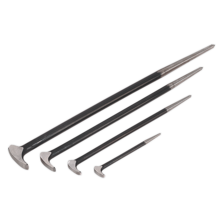 Drop-forged steel shafts with blackened finish. Hand finished heels and faces. Tapered shaft suitable for lining up components prior to assembly. Heel design maximizes leverage. Also useful for fine positioning of heavy machinery.