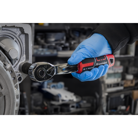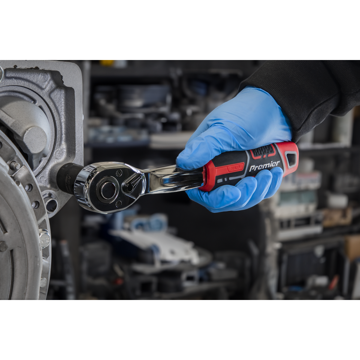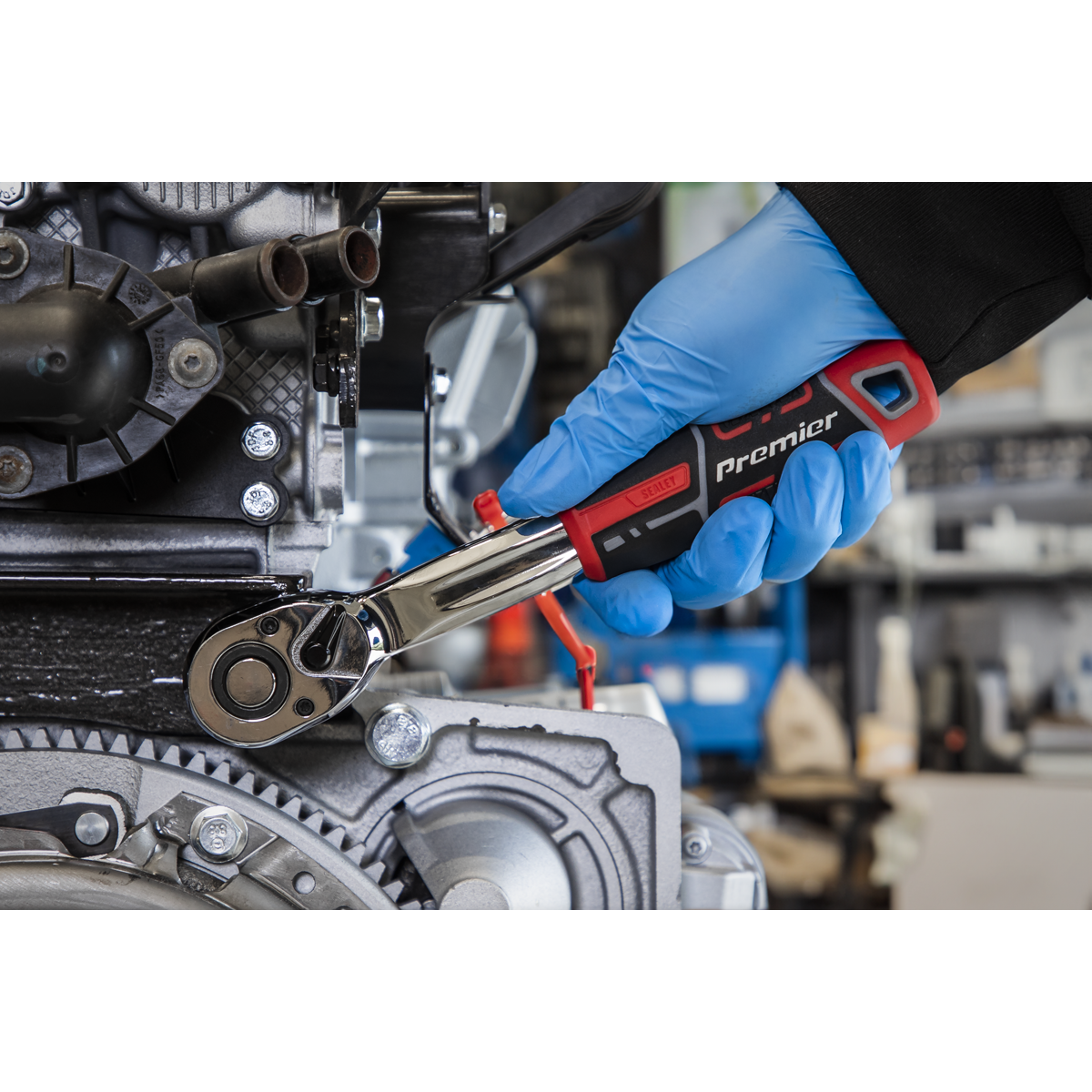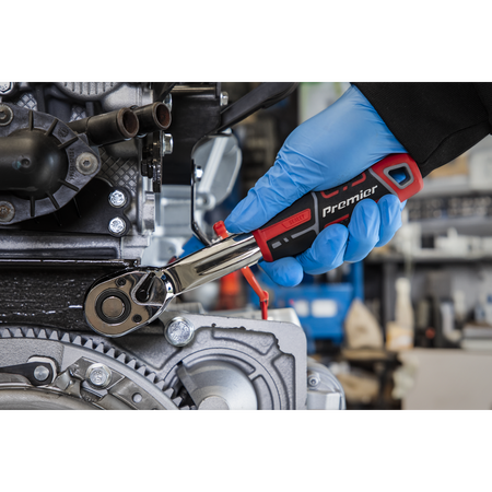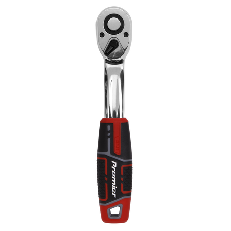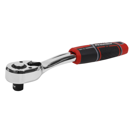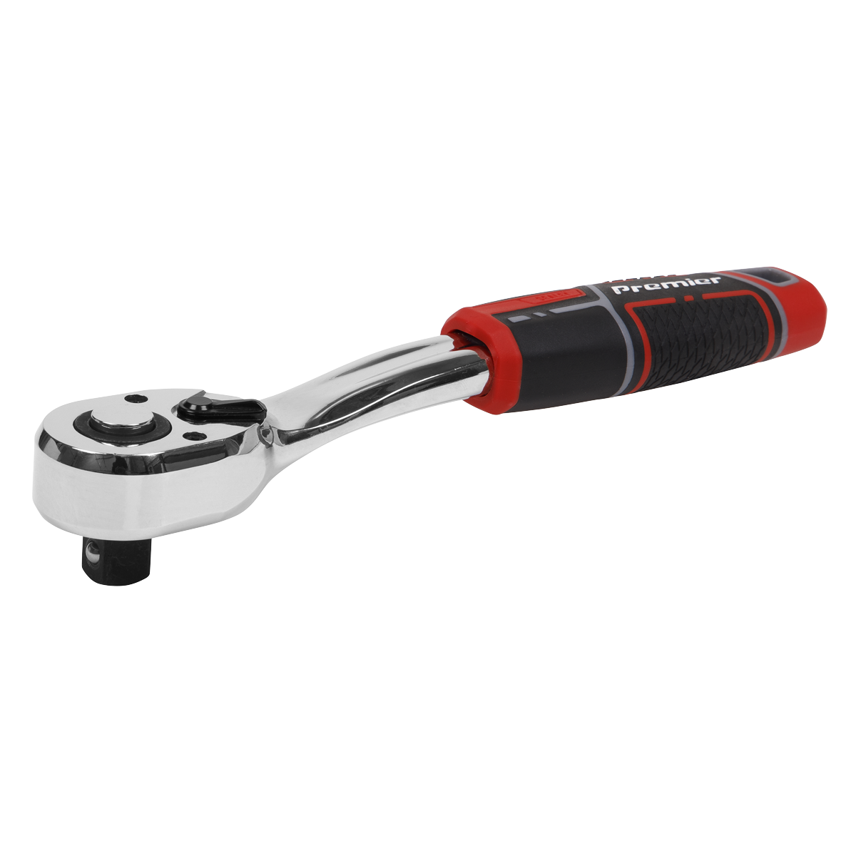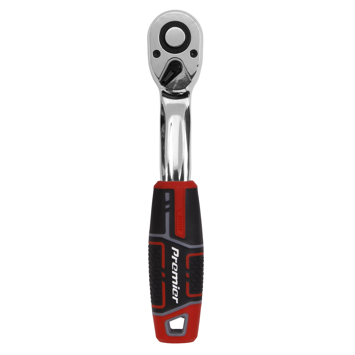 Chrome Vanadium steel gear-to-gear ratchet wrench. Hardened and tempered with a fully polished mirror finish. Ultra-smooth 72-tooth ratchet action, ideal for use in confined areas. Features pear-head with flip reverse, push-button quick release and offset handle. Polypropylene and TPV rubber soft, comfort grip.