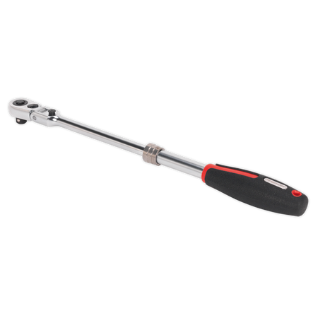 Chrome Vanadium steel ratchet wrench. Hardened and tempered with a fully polished micro satin finish. Extension retained at set increments with a quick release locking ring giving six different shaft lengths. Features 180° locking flexi-head. Compact head design and ultra-smooth 72-tooth ratchet action allowing ratcheting in increments of 5° for ease of use in restricted areas. Textured soft grip handle for comfort and control. Features flip reverse and quick release mechanism.