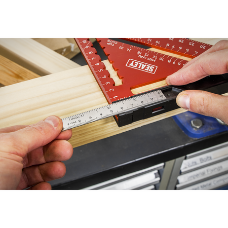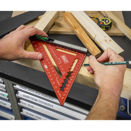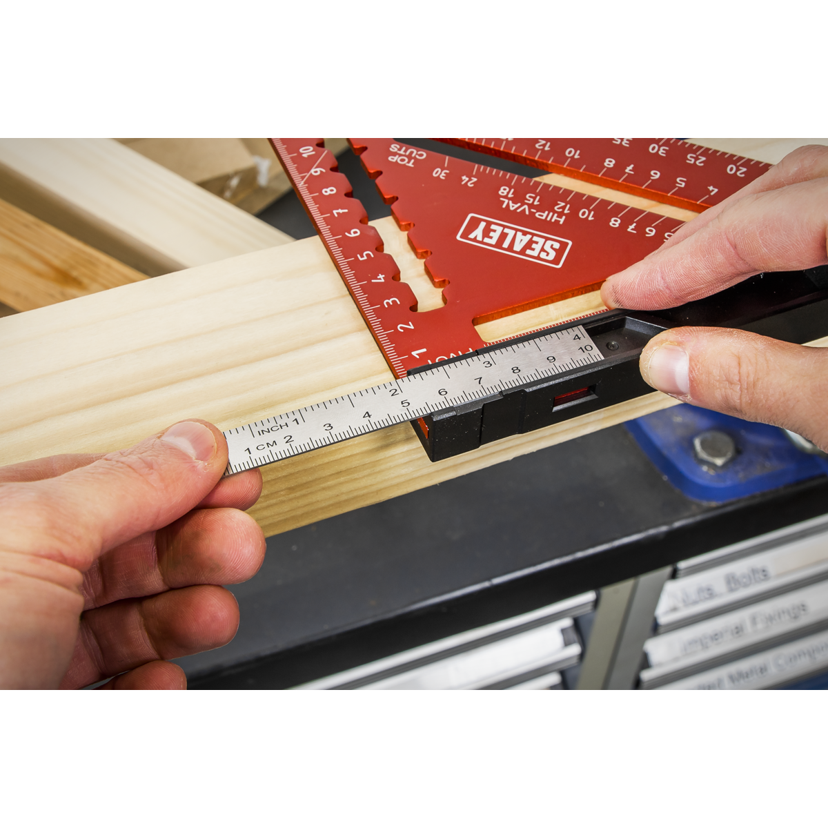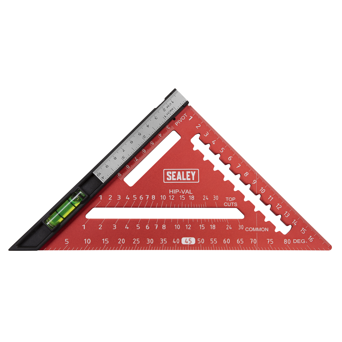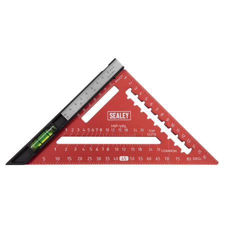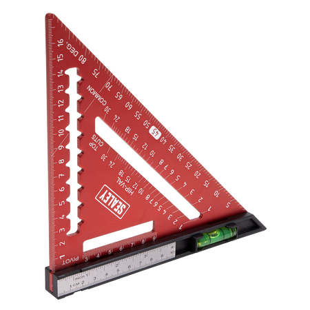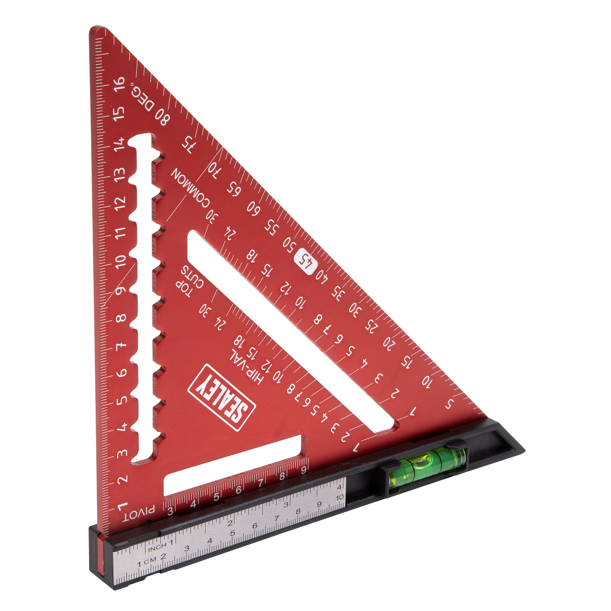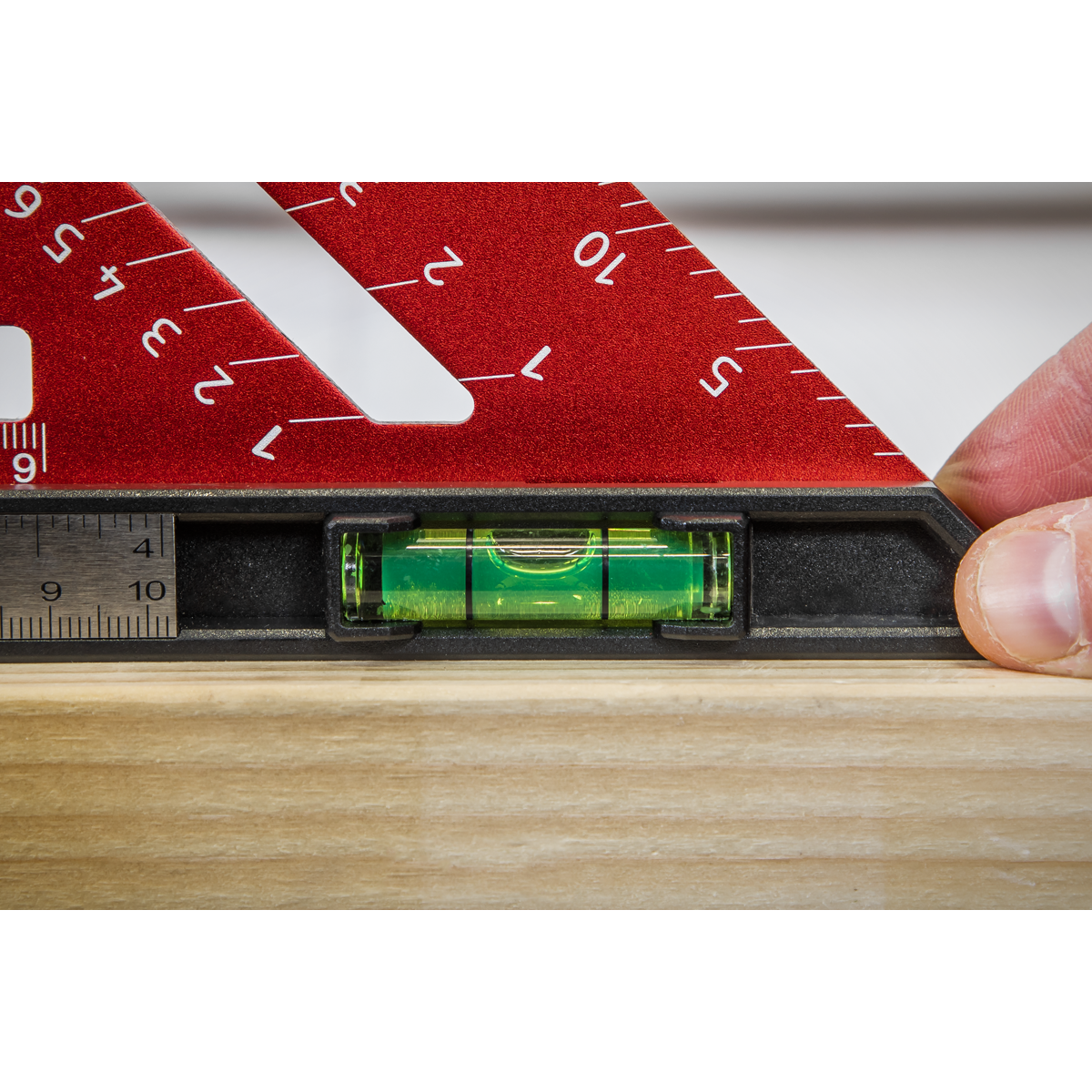 Durable high precision metal triangle with integral spirit level. Double-sided with Metric measurements. Suitable for many uses including framing square, pitch guide and mitre. Includes detachable Metric and Imperial steel rule.