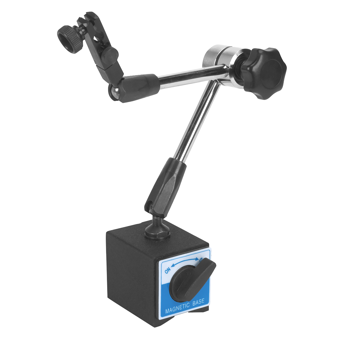 Magnetic precision ground base. Articulated arm with rotary lock. Turn magnet off to reposition, then turn switch for magnet to hold unit firmly in position. Combination dial and scribing clamp with fine adjustment control, for calibrating as well as measuring in machining, design and inspection work.