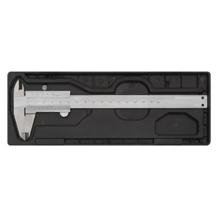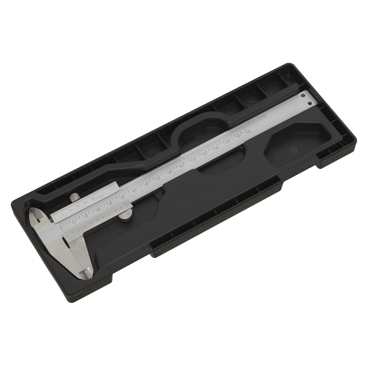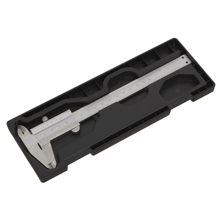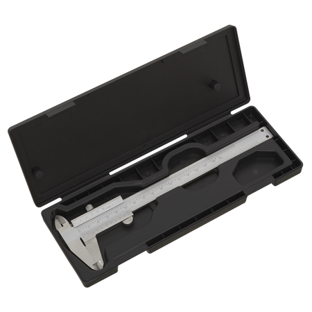 High quality, hardened and tempered stainless steel caliper with exterior/interior measurement and depth gauge. Metric and imperial scales graduated in 0.02mm and 0.001". Supplied in storage case.