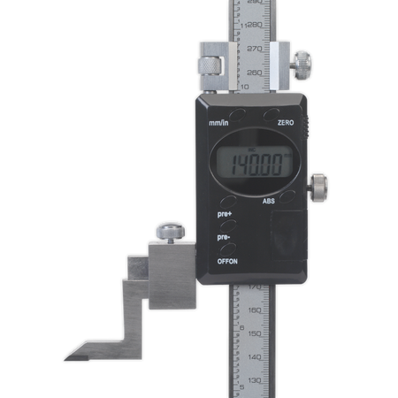 Precision ground base with 6-button electronic gauge. Includes fine adjustment control carriage for accurate use. Six digit LCD read-out displays in Metric or Imperial. Features absolute and comparative functions. Tolerance function enables fast check of batch work. Supplied with scriber foot and clamp. Powered by CR2032 battery (supplied).