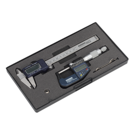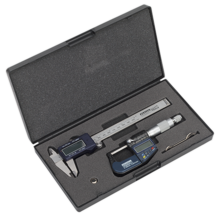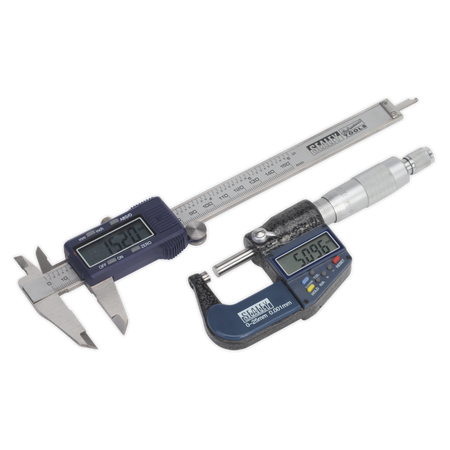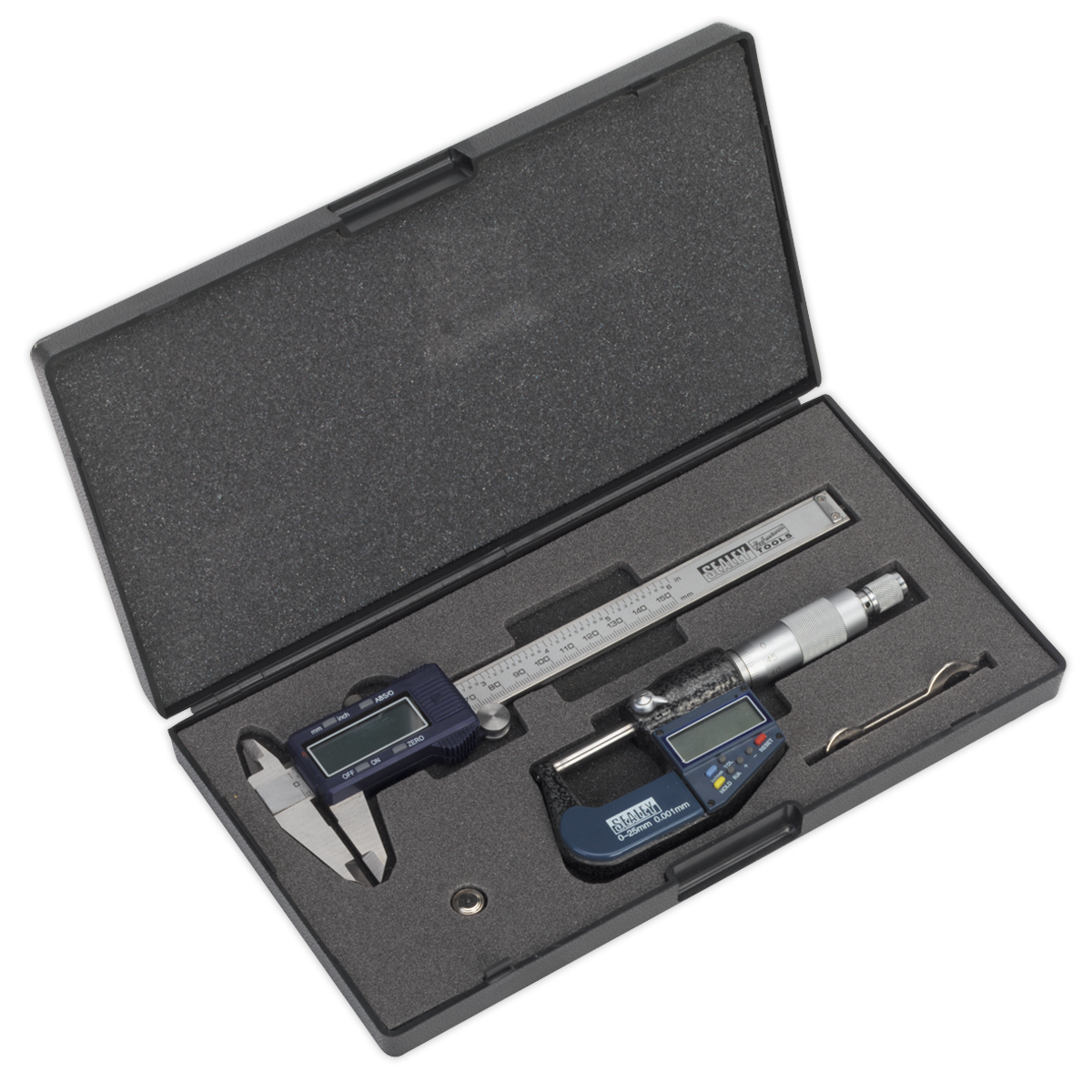 7-Button digital micrometer with satin chrome thimble and sleeve with hardened and tempered, satin finish stainless steel digital vernier caliper. Large, easy-to-read LCD read-outs. Displays switchable between Metric and Imperial units. Zero display at any point allows comparative measurement. Supplied in storage case with micrometer adjustment wrench.