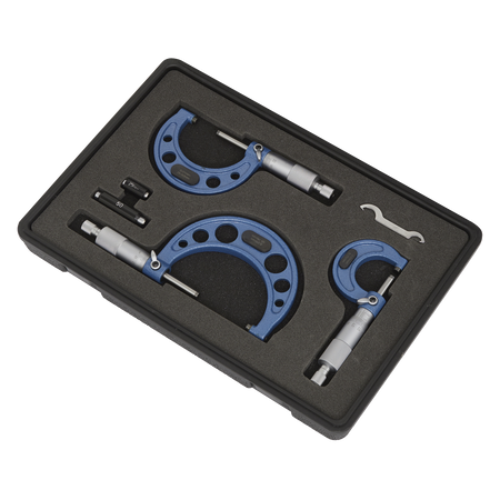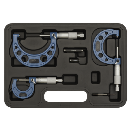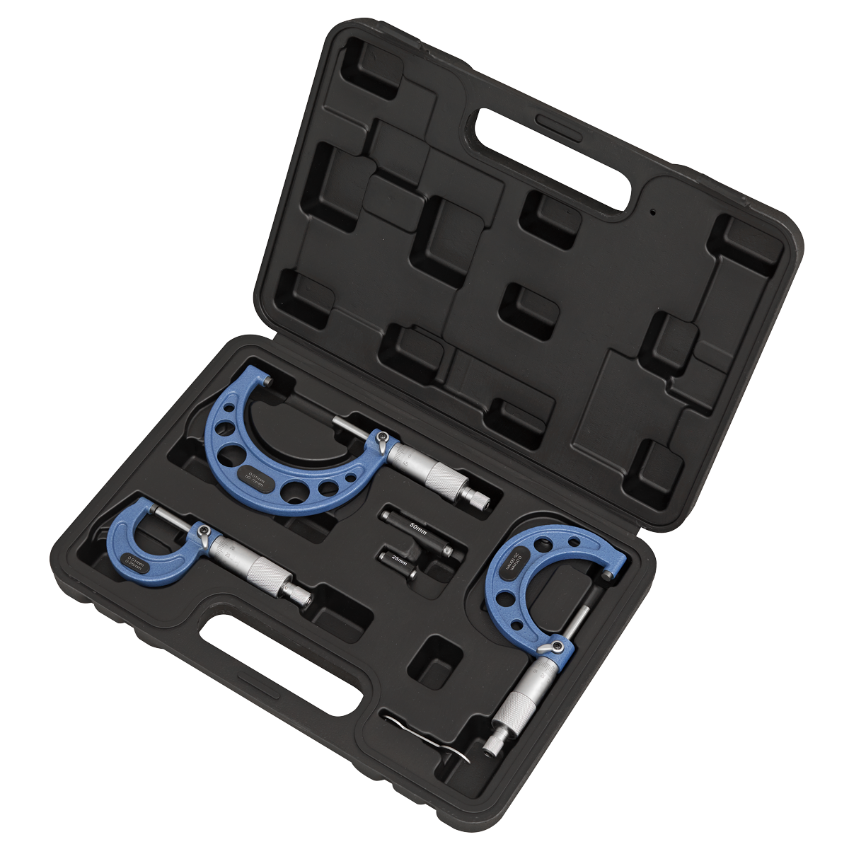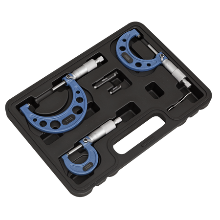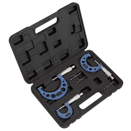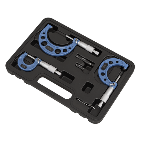 Comprising three Metric micrometers. Steel yoke, satin chrome finished thimble and sleeve with heavily machined knurling and locking mechanism. Supplied in foam lined, storage case with two calibrated spacers and thimble wrench.