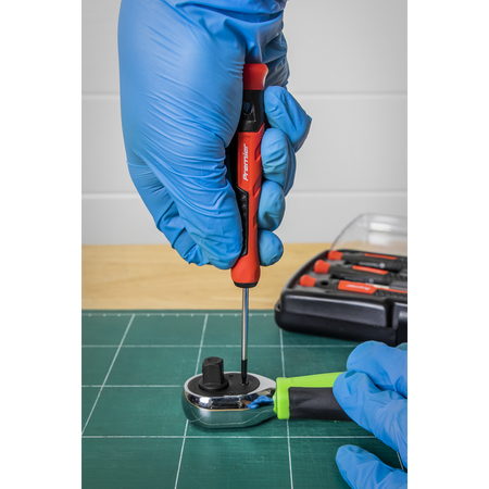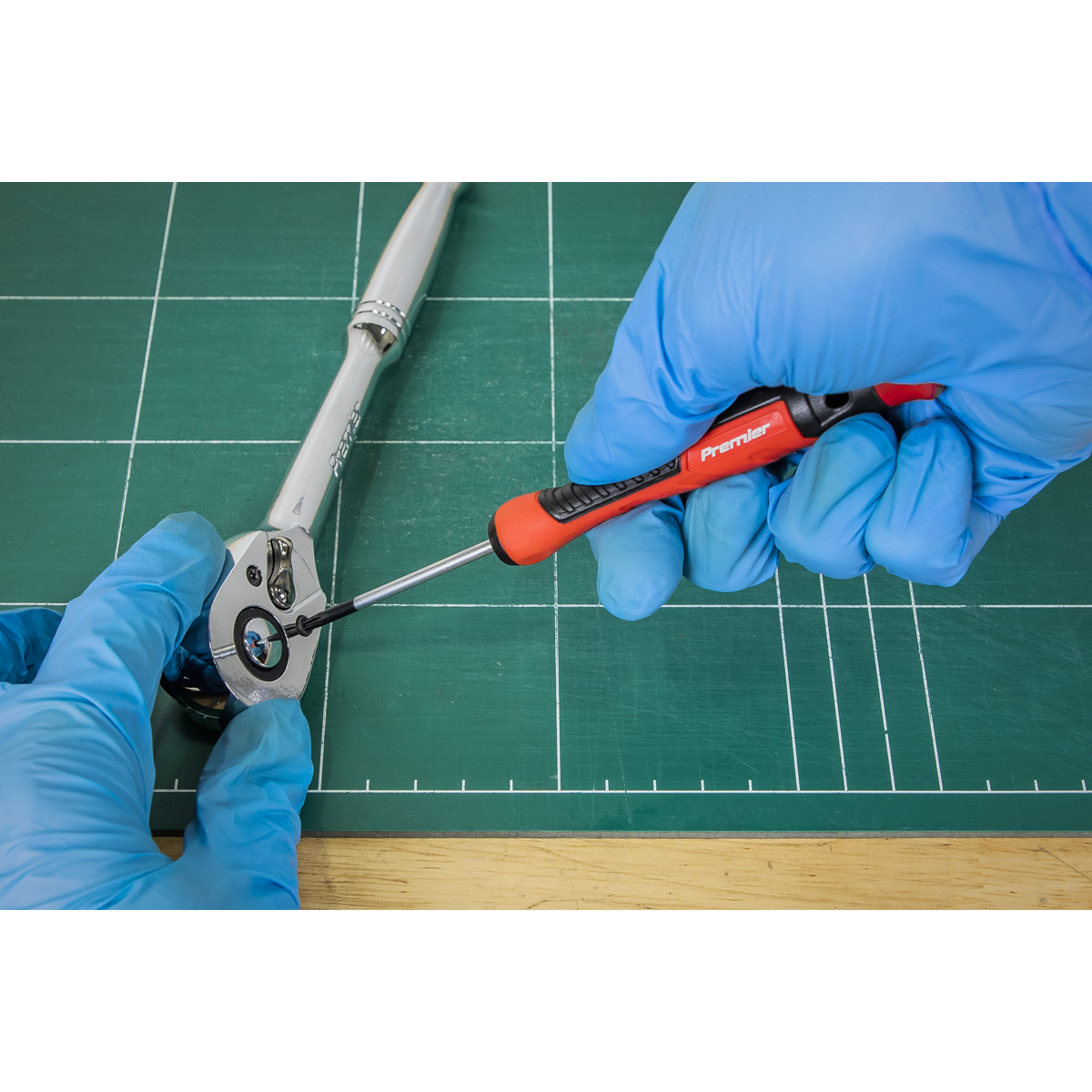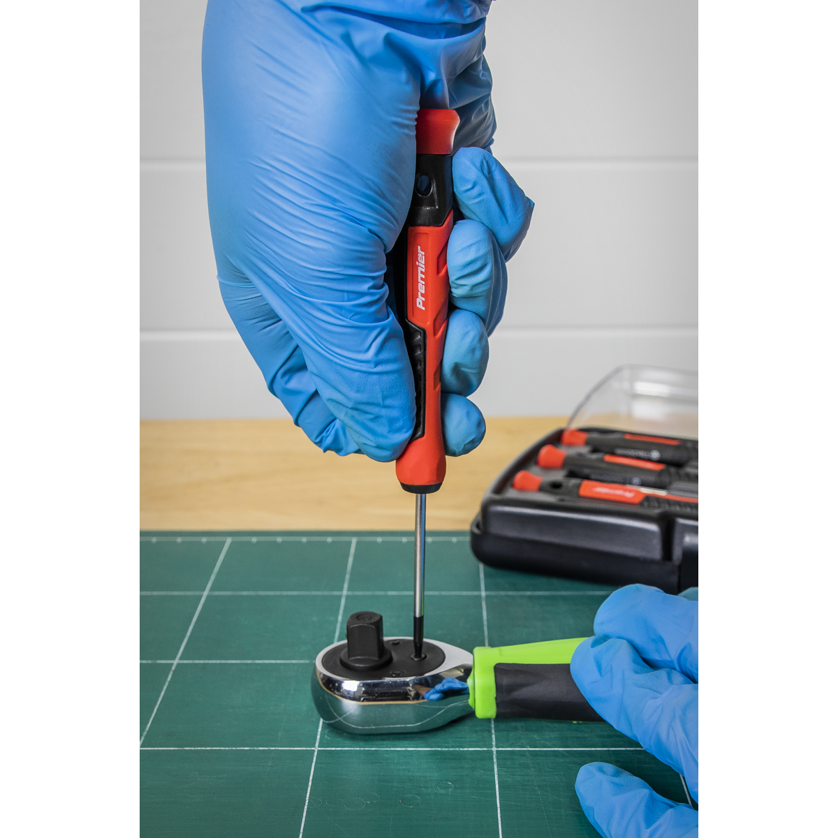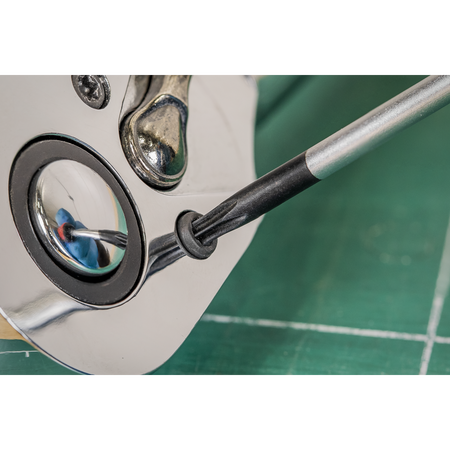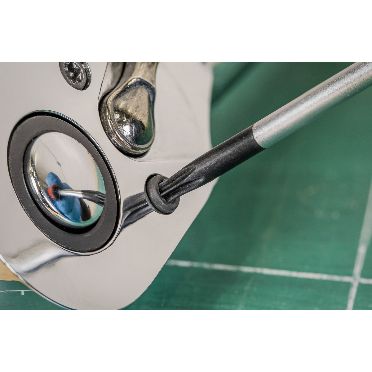 High quality S2 steel shafts with shot blasted and blackened tips. Contoured handle with soft rubber grip for added control, includes hanging holes. Spinner top enables fingertip control of driver. Supplied in storage case.