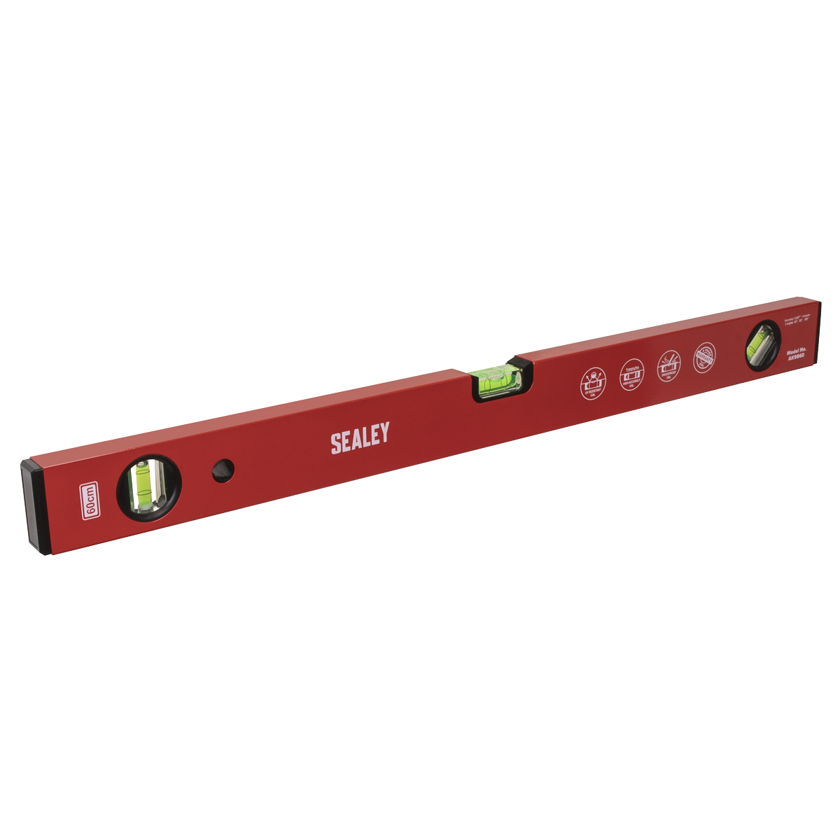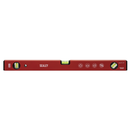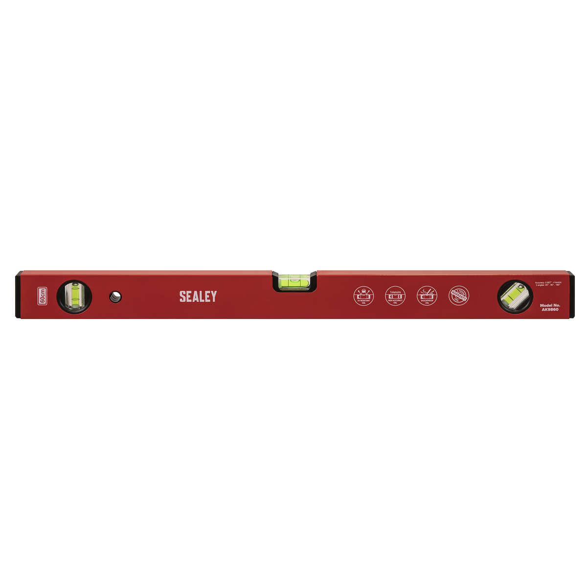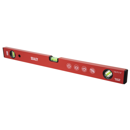 Extruded 0.9mm aluminium box section level. Powder coated for corrosion resistance. Accuracy 1mm in 1m (0.057°). Model includes UV resistant and shockproof vials, one horizontal with side view, one vertical and one 45°. Base with precision milled face.