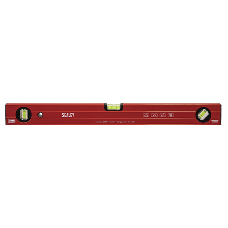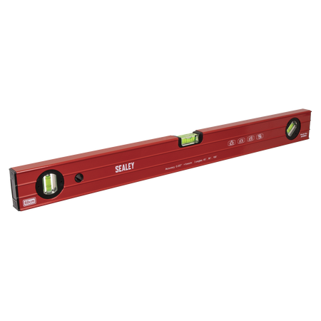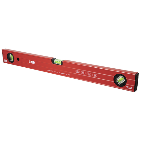 1mm Aluminium ribbed box section level. Powder coated for corrosion resistance. Accuracy 1mm in 1m (0.057°). Model includes UV resistant and shockproof vials, one horizontal with side view, one vertical and one 45°. Base with precision milled face.