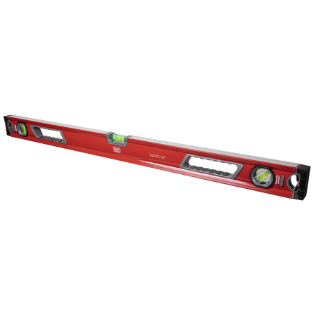 1mm Aluminium box beam section level. Powder coated for corrosion resistance. Accuracy 1mm in 1m (0.057°). Model includes UV resistant and shockproof vials, one horizontal with side view, one vertical and one 45°. Precision milled face on top and bottom.