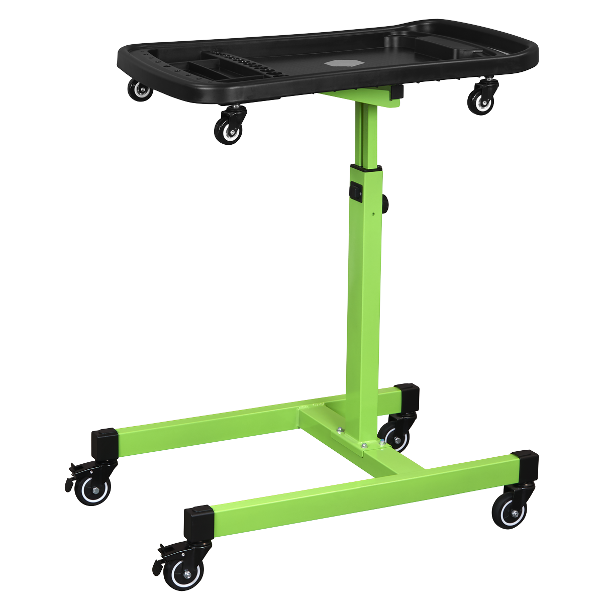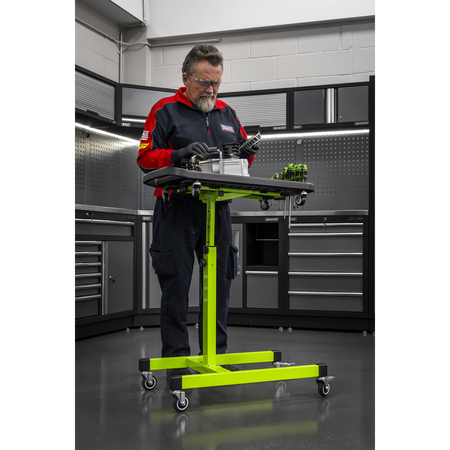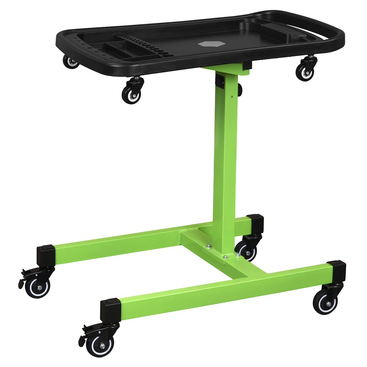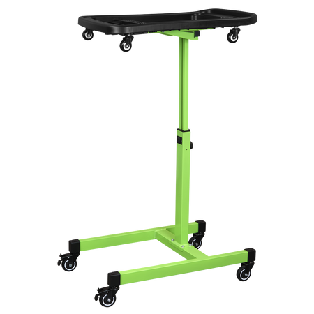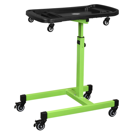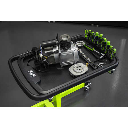 Adjustable table height from 775-1200mm. Features two magnetic collection trays, two small tool storage sections, one large section for main workpiece as well as nine screwdriver storage holes and 15 socket storage slots. Top tray can be removed and used as a tool creeper on the ground. Fitted with four rubber coated castors for manoeuvrability in workshops and warehouses. Maximum Weight Capacity: 60kg.