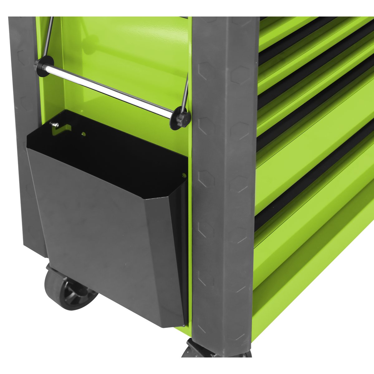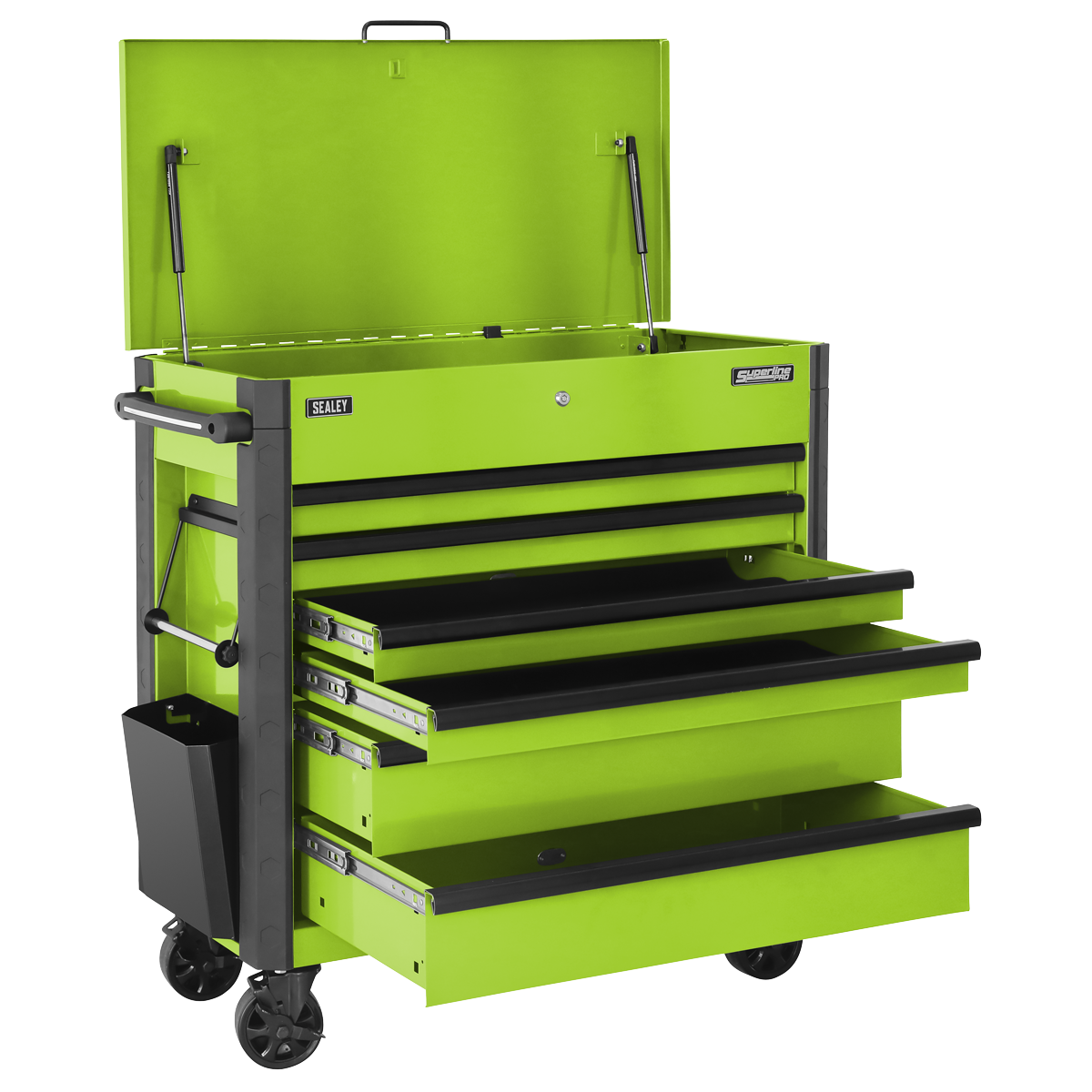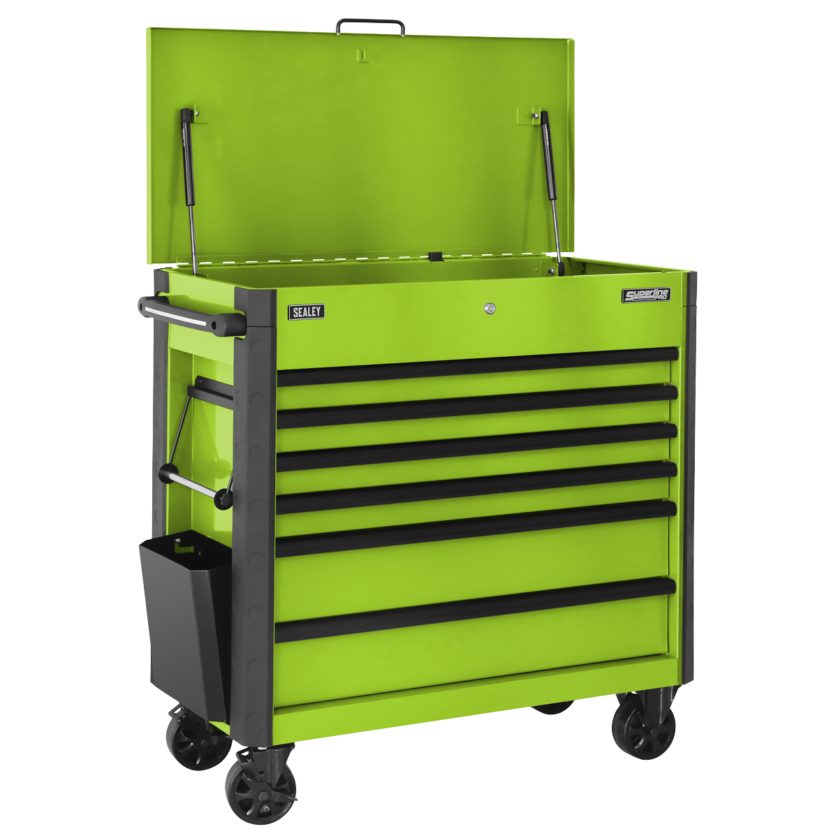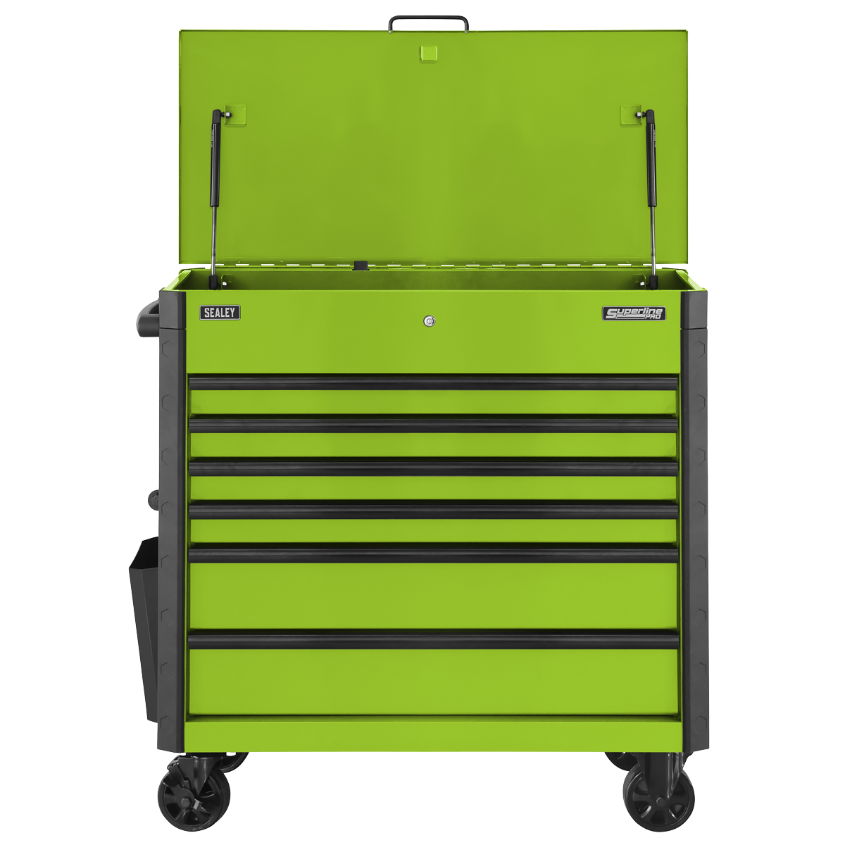 Manufactured from double skin side walls. Full length locking bars secure all drawers when the lid is closed which can then be locked by the barrel lock supplied with two keys. Coated in high-gloss triple baked enamel for protection against oil, dirt and mild solvents. Full length TPR anti-shock protective bumpers on all corners prevent damage when moving around the workshop. Fitted with four stylish Ø125 castors, two fixed and two swivel with brakes and a durable shatter-proof plastic side handle. Supplied with a can storage tray, waste bin and paper roll holder. Six drawers each supplied with a cut-to-size non-slip liner. Deep storage compartment inside of the gas strut lid.
