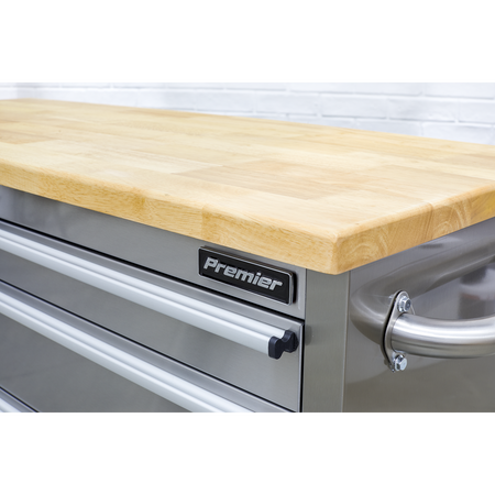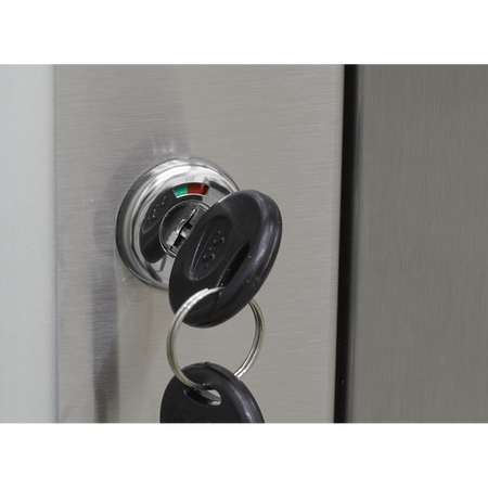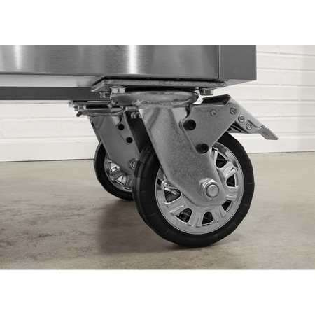 Anti-fingerprint stainless steel construction. Supplied with a 25mm thick wooden worktop. Four drawers with 45kg capacity each. Each drawer features aluminium pull handles and non-slip liners. Side storage cupboard with shelf and pegboard inlay. Four large castor wheels, two fixed and two swivel that include brakes. Cabinet supplied with a heavy-duty side handle for comfort and control when manoeuvring. Supplied with a lock and two keys. Some simple assembly required.