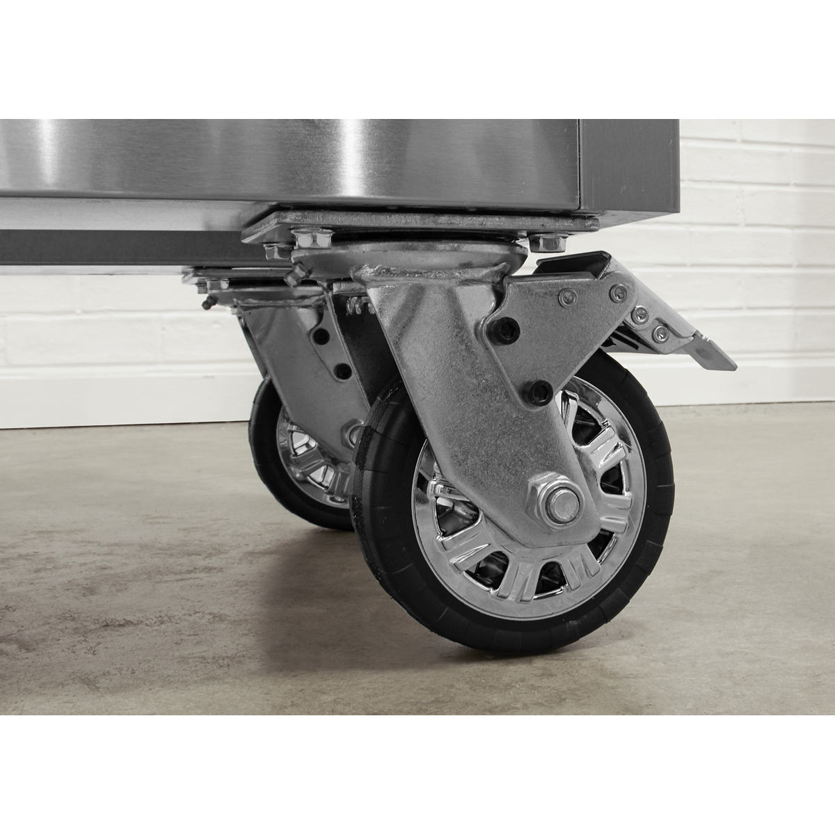 • Four large castor wheels, two fixed and two swivel that include brakes.