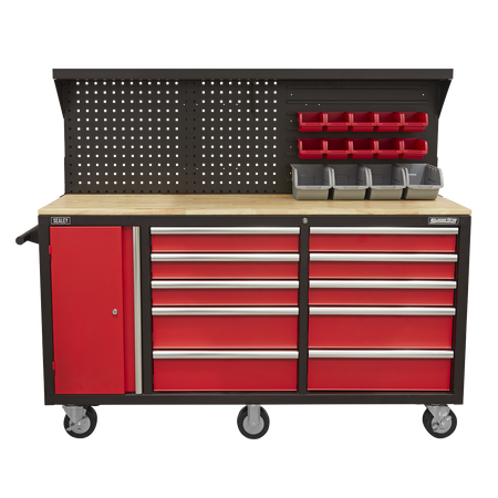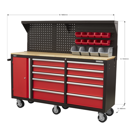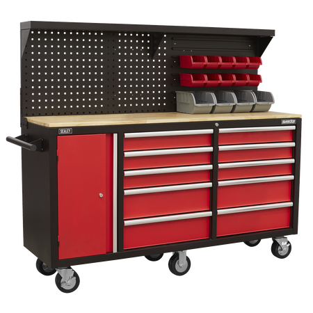 Features a cabinet for extra storage and a heavy-duty side handle for comfort and control when manoeuvring. Thick 20mm wooden worktop. 10 Drawers with 40kg capacity each with aluminium pull handles and non-slip liners. Six large castor wheels, four swivel with brakes and two fixed. Supplied with a pegboard back panel compatible with TSS range of hooks ideal for hanging tools, plus 14 storage bins in two sizes. Supplied with locks and two keys for the cabinet and drawers. Some simple assembly required.