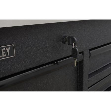 All heavy-duty steel construction and manufactured with steel inner walls for extra strength and durability. Heavy-duty 45mm ball-bearing drawer slides provide superior performance, suitable for heavier loads. Full height rear locking mechanism, locks smooth running soft close drawers in place. Rust and solvent resistant black crinkle effect finish. Fitted with six Ø125mm PP wheels with black chrome effect alloys, two fixed, two swivel and two swivel with brakes. Each drawer features stylish black anodized heavy-duty drawer pulls plus pre-cut non-slip liners. Power tool charging drawer fitted with 4x 230V, 1x USB-C and 3x USB. Mounting points to fit additional four gang power bar - Model No. EL34USBB (not included). Stainless steel 'flip-top' split equally into 2-sections providing a work surface and additional storage. Two cylinder locks allow drawers and power tool charging drawer to be locked separately.