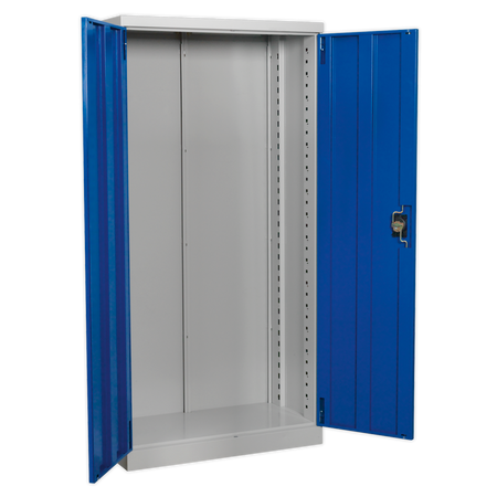 Industrial quality, double door, freestanding cabinet. Unit easy to assemble with minimal tools required. Durable, scuff resistant design. Reinforced steel doors with zinc plated locking bars provide 3 point locking mechanism. Supplied with two coded keys. Ideal for home, office, garage or workshop use.
