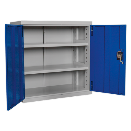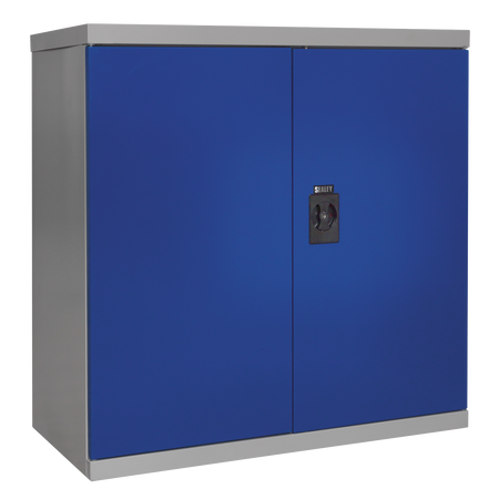 Industrial quality, double door, freestanding cabinet with two shelves. Unit is easy to assemble with minimal tools required. Durable, scuff resistant, adjustable shelves, each holding up to 150kg. Reinforced steel doors with zinc plated locking bars providing 3-point locking mechanism. Supplied with two coded keys. Ideal for home, office, garage or workshop use.