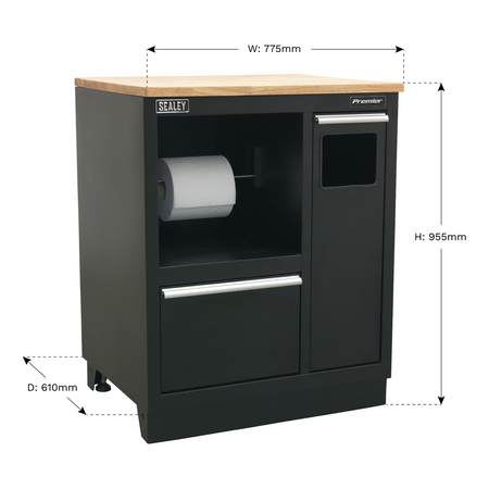 N.B. ILLUSTRATED WITH OPTIONAL WORKTOP - Don't forget to order your choice of hardwood or stainless steel separately. Use as part of a complete professional garage storage system or as an individual storage unit. All steel construction with a graphite powder coat finish. Brushed aluminium handles. Choice of stainless steel or hardwood worktop. Heavy-duty multifunction modular cabinet includes rubbish bin, paper roll holder and a deep drawer. Four adjustable feet allow the cabinet to sit true. Paper roll holder has three locking positions to allow different sized rolls to be stored. Supplied fully assembled.