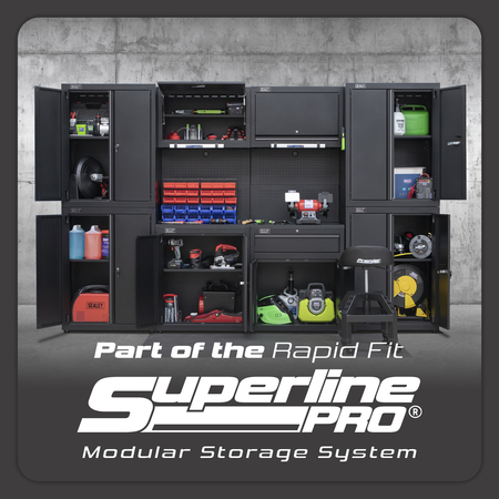 Our Rapid-Fit models are designed with a hinged system to fold-out from flat pack to finish in minutes. Base units fitted with stylish black MDF worktops and adjustable feet. Fitted with ball-bearing drawer runners and magnetic door latches. Pegboard design backing panels for additional storage. Extra units available to extend the storage system if required. Quick and easy to assemble, some basic tools required.