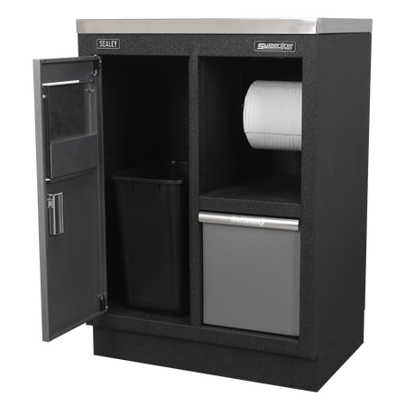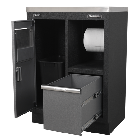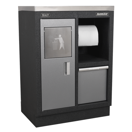 • Solid multifunction modular cabinet includes rubbish bin, paper roll holder and a deep drawer.
