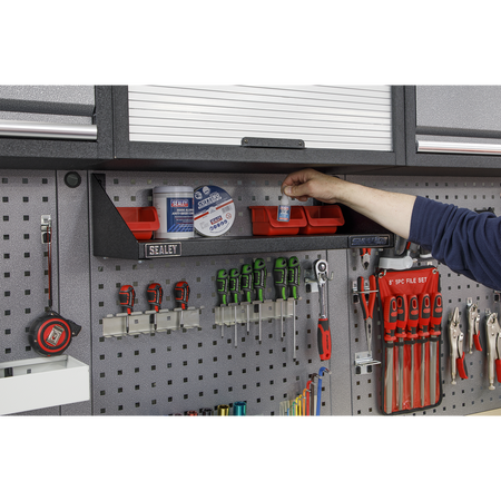 Tough and durable easy fit shelf with hammered metal finish. Ideal for storing small components and keeping work areas clean and tidy. Suitable to fit on the back panel of the APMS Superline Pro Wall Cabinets and Storage Systems. To be used specifically with APMS50BP or APMS60BP back panels. Minimal assembly required.