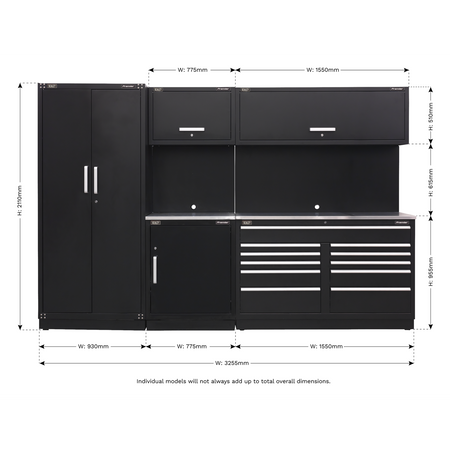 All steel construction with graphite powder coat finish. Brushed aluminium drawer pulls and handles. Heavy-duty drawers with rubber liners and precision ball-bearing drawer slides. Concealed snap-close magnets on doors. 25mm stainless steel worktop. Gas struts on wall cabinet doors. Adjustable feet to ensure cabinets sit 'true' even on floors that are not level. Each unit supplied with high quality cylinder locks and two keys where applicable.
