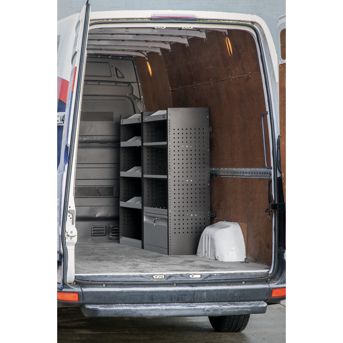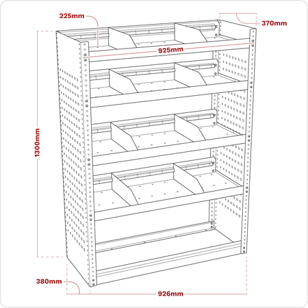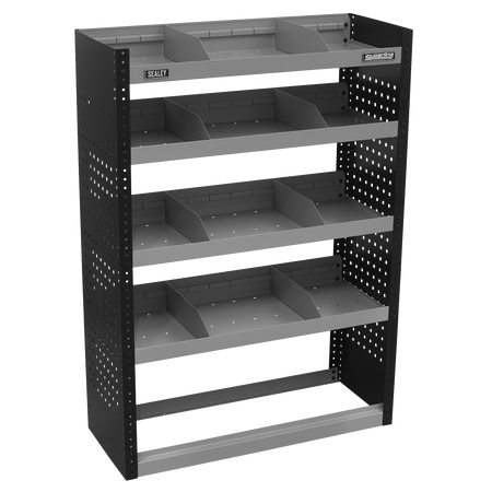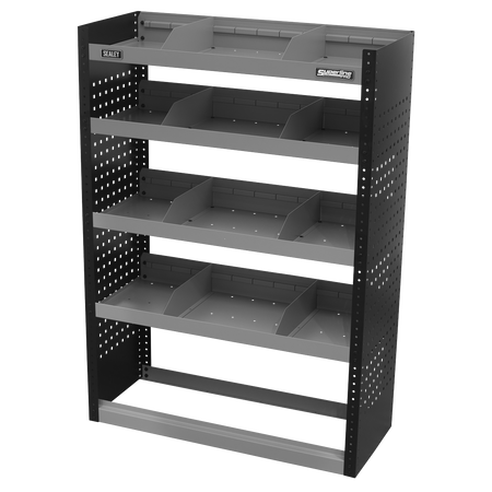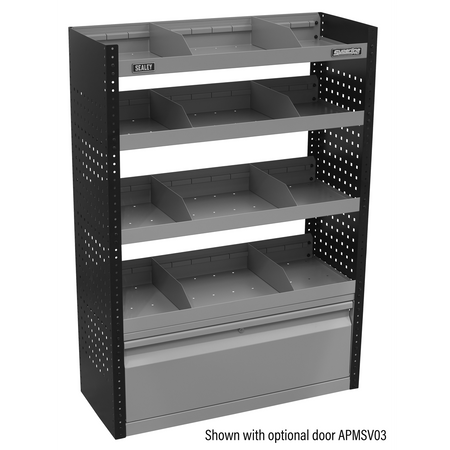Modular van storage system designed to fit medium and large vans. Designed to fit close to the interior walls of the van freeing up precious floor space. Robust steel construction with perforated tool side panels for extra organisation. Three shelves that can be height adjusted in 25mm increments. Eight dividers that adjust every 75mm ideal for parts trays and plastic parts bins. Supplied flat-packed with six brackets to ensure security and rigidity. Lockable door APMSV03 available (not included).