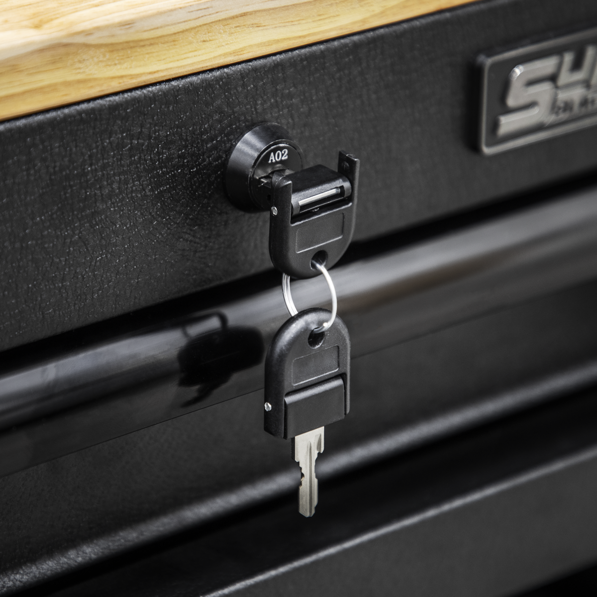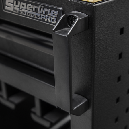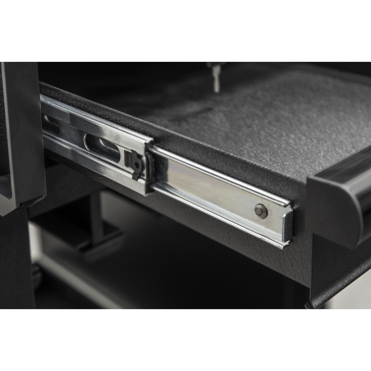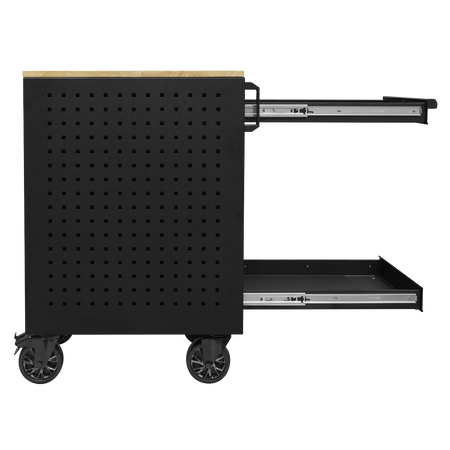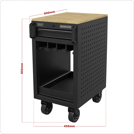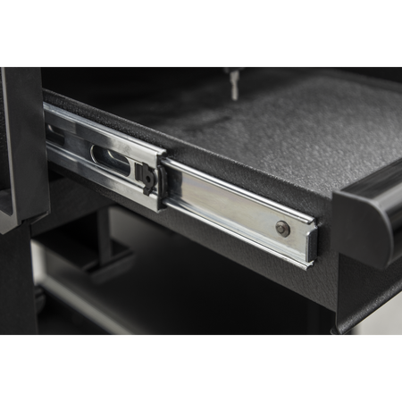 450mm Workshop trolley capable of holding eight power tools. Heavy gauged steel construction with a rust and solvent resistant black crinkle effect finish. Two drawers, one lockable, add extra secure storage space. Drawers supplied with 45mm soft close ball-bearing slides and 2mm EVA liners. 18mm Pressed wood top. Two steering swivel castors with quick release toe locks and two fixed castors make it easy to manoeuvre around any workshop or garage.