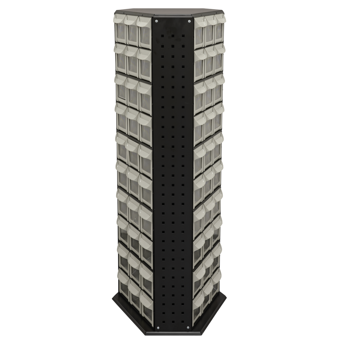 Freestanding rotating storage system featuring 90 small parts bins. Ideal for workshop or stores use. Fitted with roller bearings allowing 360deg movement.,• FREESTANDING - Freestanding rotating parts storage system featuring 90 small parts bins.