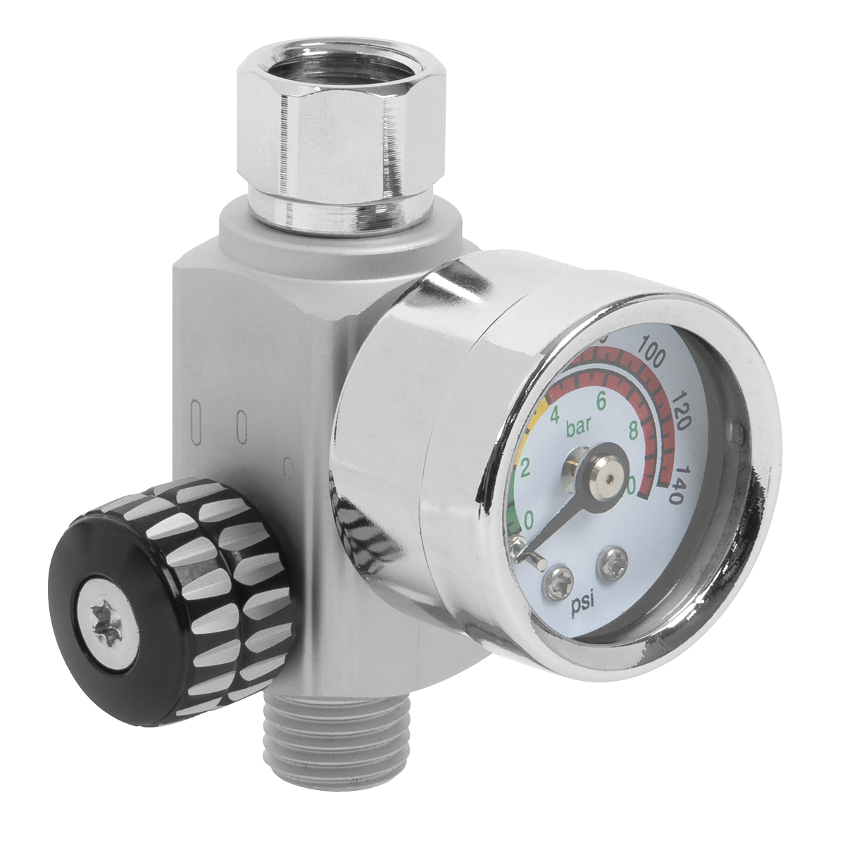 On-Gun Air Pressure Regulator/Gauge. Couples directly to spray gun air inlet to control air flow and pressure. Max. Pressure/Flow: 140psi/17cfm @ 60psi. Just one of a comprehensive range of quality spray gun accessories.
