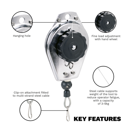 Designed to support the weight of the tool, reducing operator fatigue and keeps the work area free of clutter. Simple clip-on tool attachment fitted to multi-strand steel cable. Fine load adjustment with hand wheel.