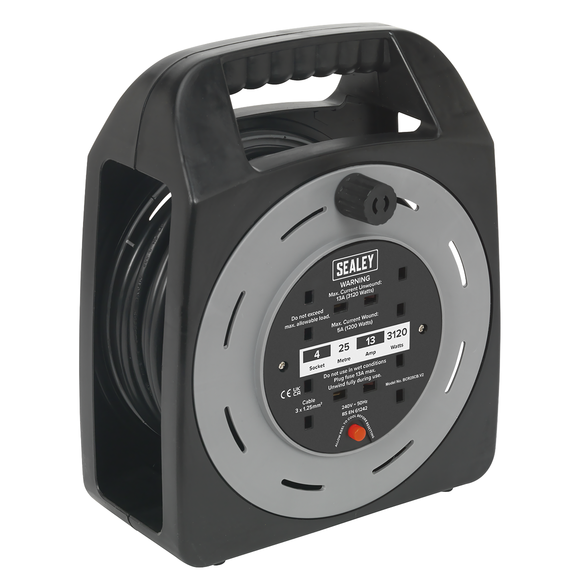 Cassette style reel with 4 x 230V power sockets. Features thermal overload protection and built-in carry handle. Fitted with 3-pin plug.