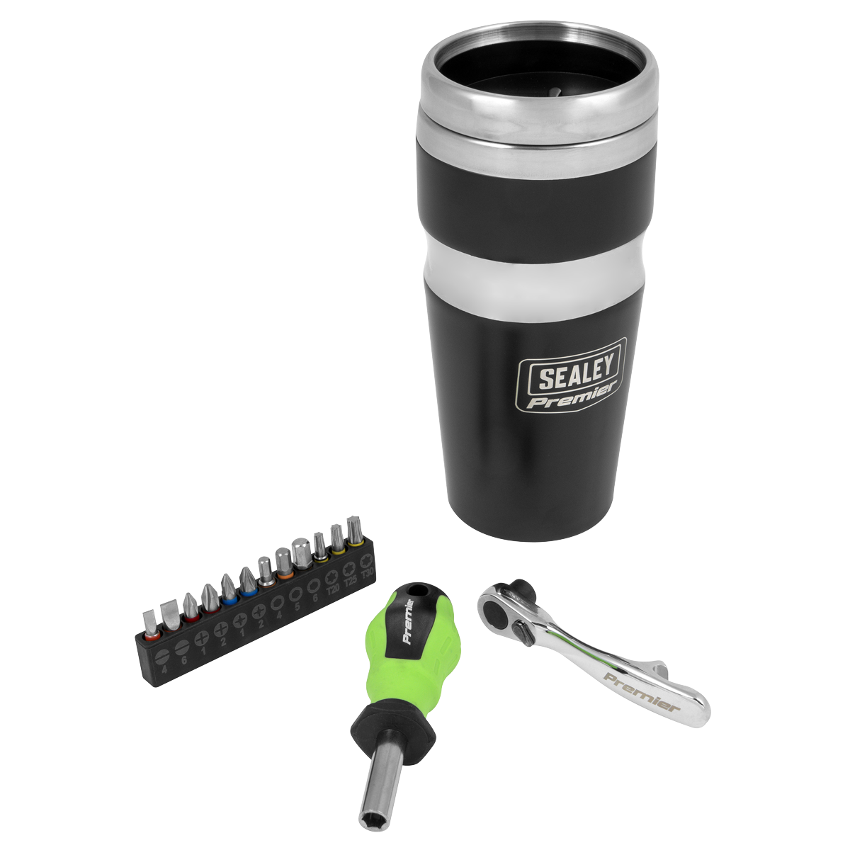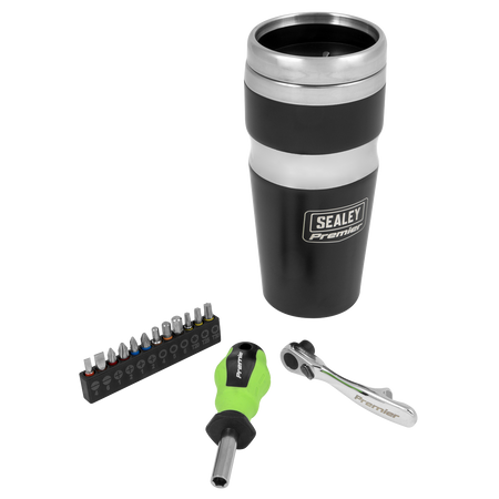The Sealey travel mug with tool kit makes the perfect gift for every tool enthusiast. Stainless steel vacuum insulated double wall reusable travel mug. Keeps drinks hot or cold. Fits most cup holders. Includes 1/4"Hex Chrome Vanadium steel 72-tooth micro ratchet bit driver with bottle opener, stubby bit driver with comfortable soft grip handle and a popular range of S2 steel 1/4"Hex colour-coded bits. Use and Care: *Please handwash cup after every use. *Cup not fully spill-proof.