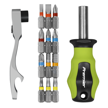 • Includes 1/4"Hex Chrome Vanadium steel 72-tooth micro ratchet bit driver with bottle opener, stubby bit driver with comfortable soft grip handle and a popular range of S2 steel 1/4”Hex colour-coded bits.