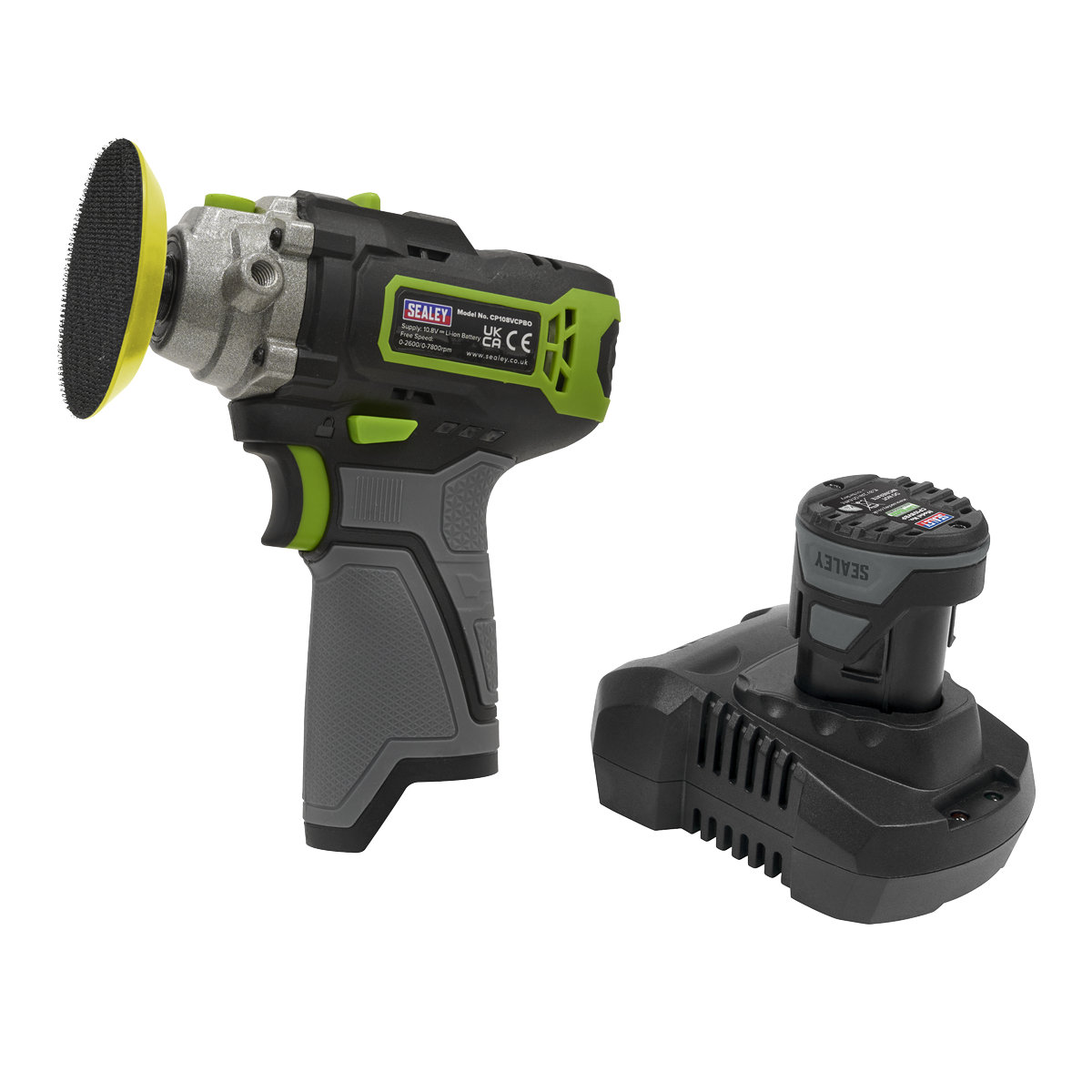 Compact, lightweight cordless polisher. Comfortable housing with soft grip to help reduce vibration. Variable speed for controlled operation. Supplied with side handle and polishing pad as well as a fast charge mains charger and 1 x 2Ah rechargeable lithium-ion battery.,• Part of the SV10.8 Series powered by fast charging high output lithium-ion batteries, designed to make everyday tasks quick and easy.