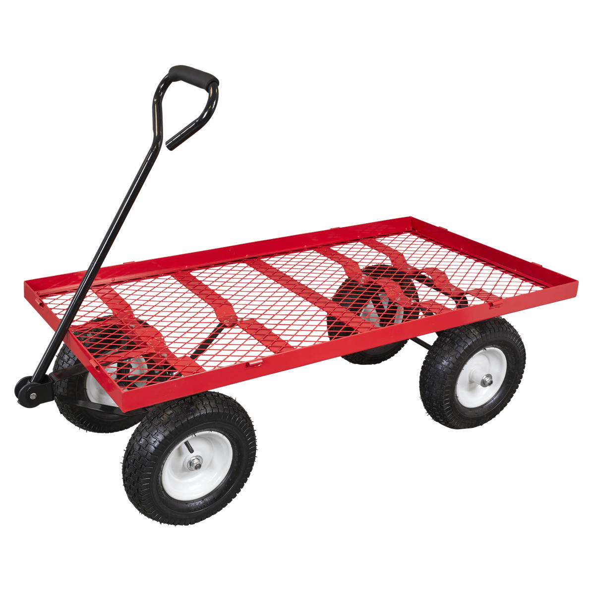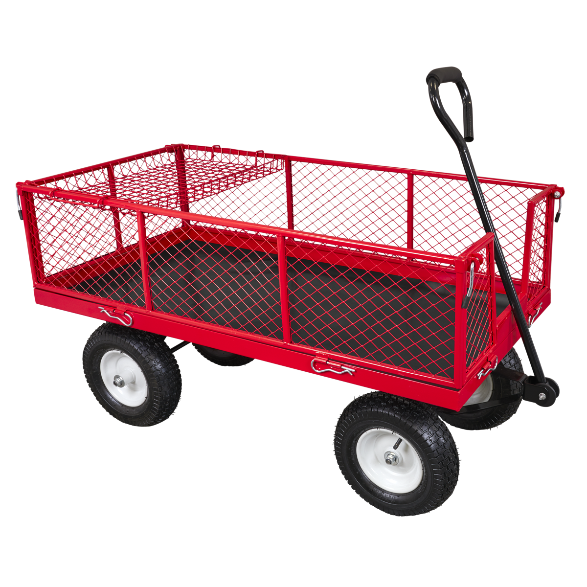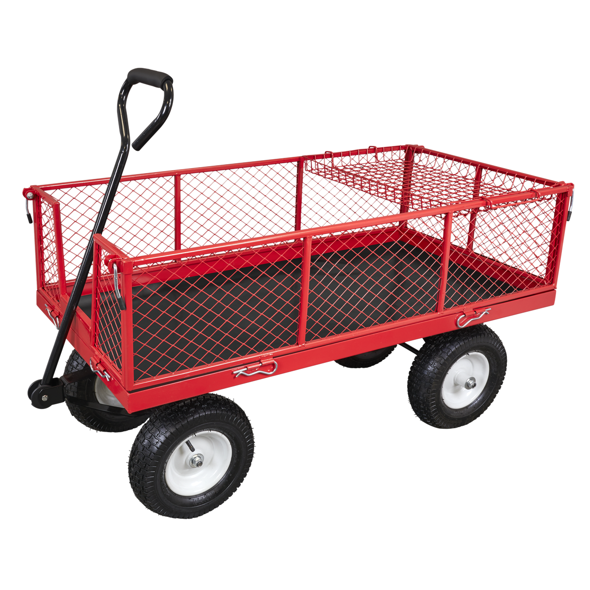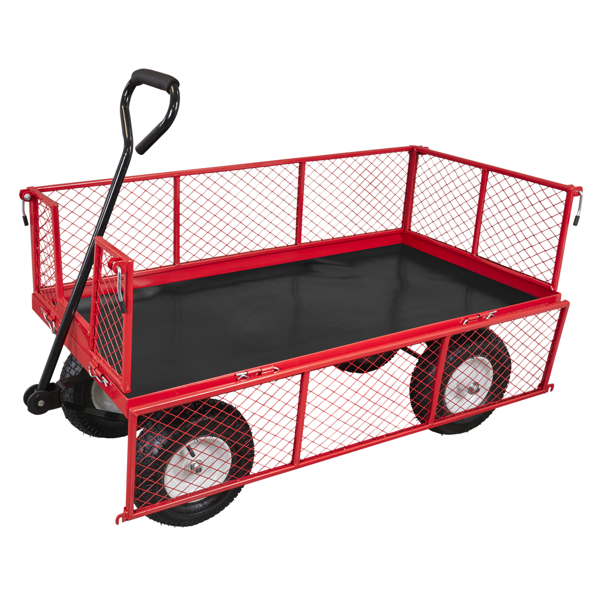 Heavy-duty rust resistant steel construction. Smooth steering action for easy manoeuvrability, with soft rubber gripped handle and pneumatic wheels for easy transportation over the toughest terrain. All four sides drop-down using locking pin function for easy loading. Can also be used as a flatbed for transporting oversized items. Fitted with additional removable storage tray for carrying smaller items. Suitable for a variety of warehouse, office, garden and domestic applications.