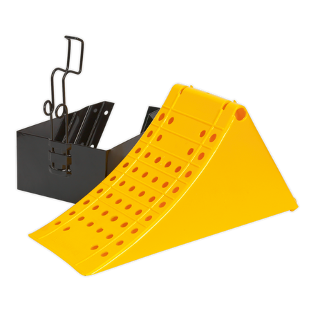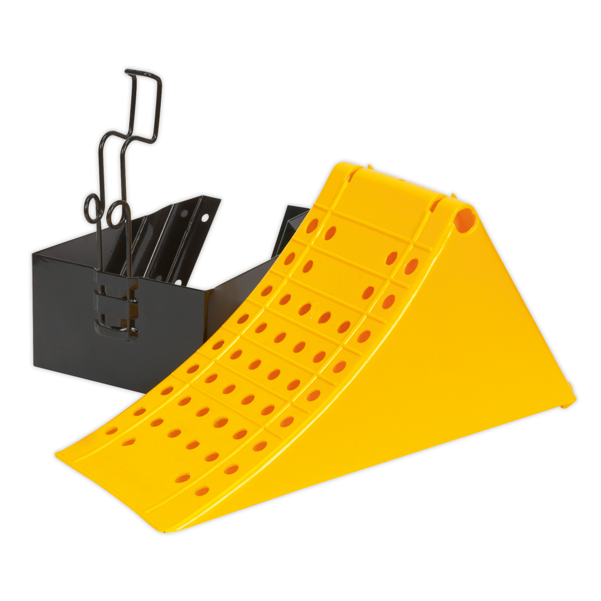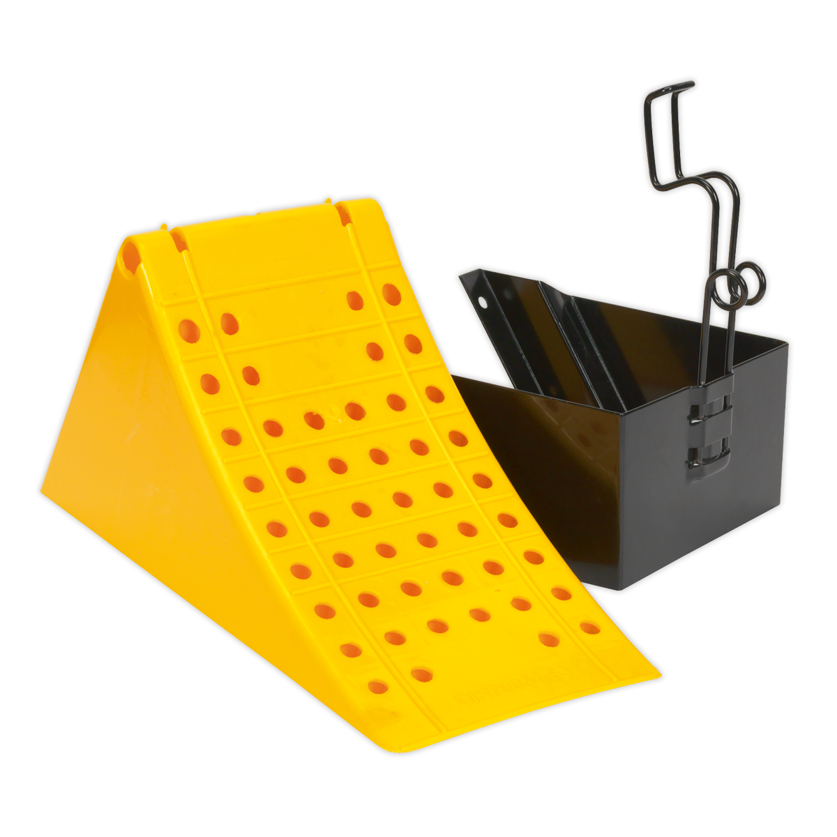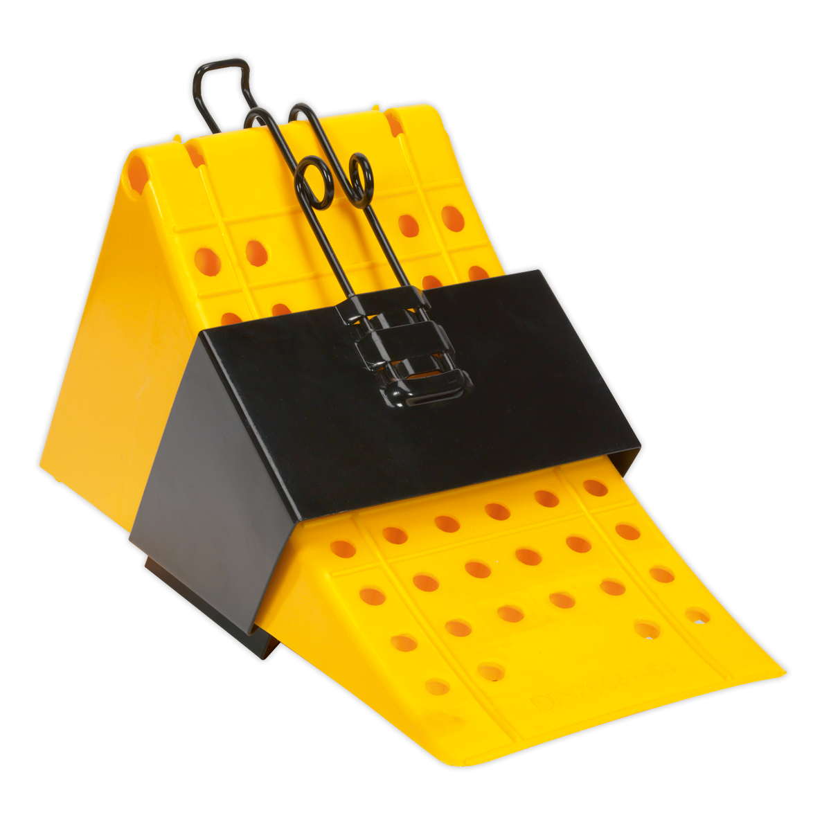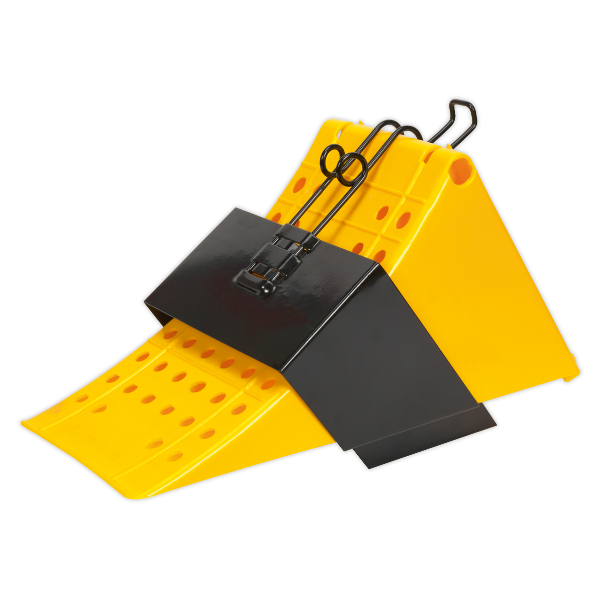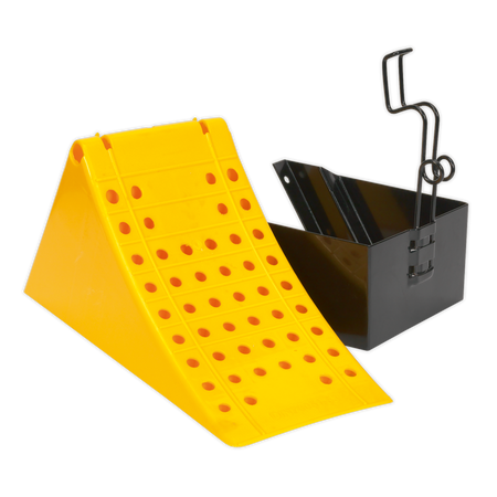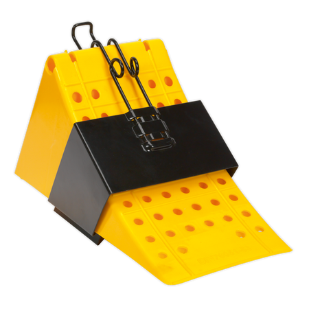High-density plastic with anti-slip steel bar. Prevents a maximum 30 Tonne vehicle’s movement when being jacked on a level surface or parked on an incline not exceeding 12°. Steel chock bracket designed to mount to wall or trailer.