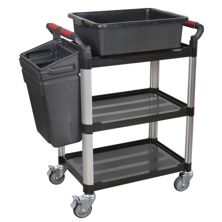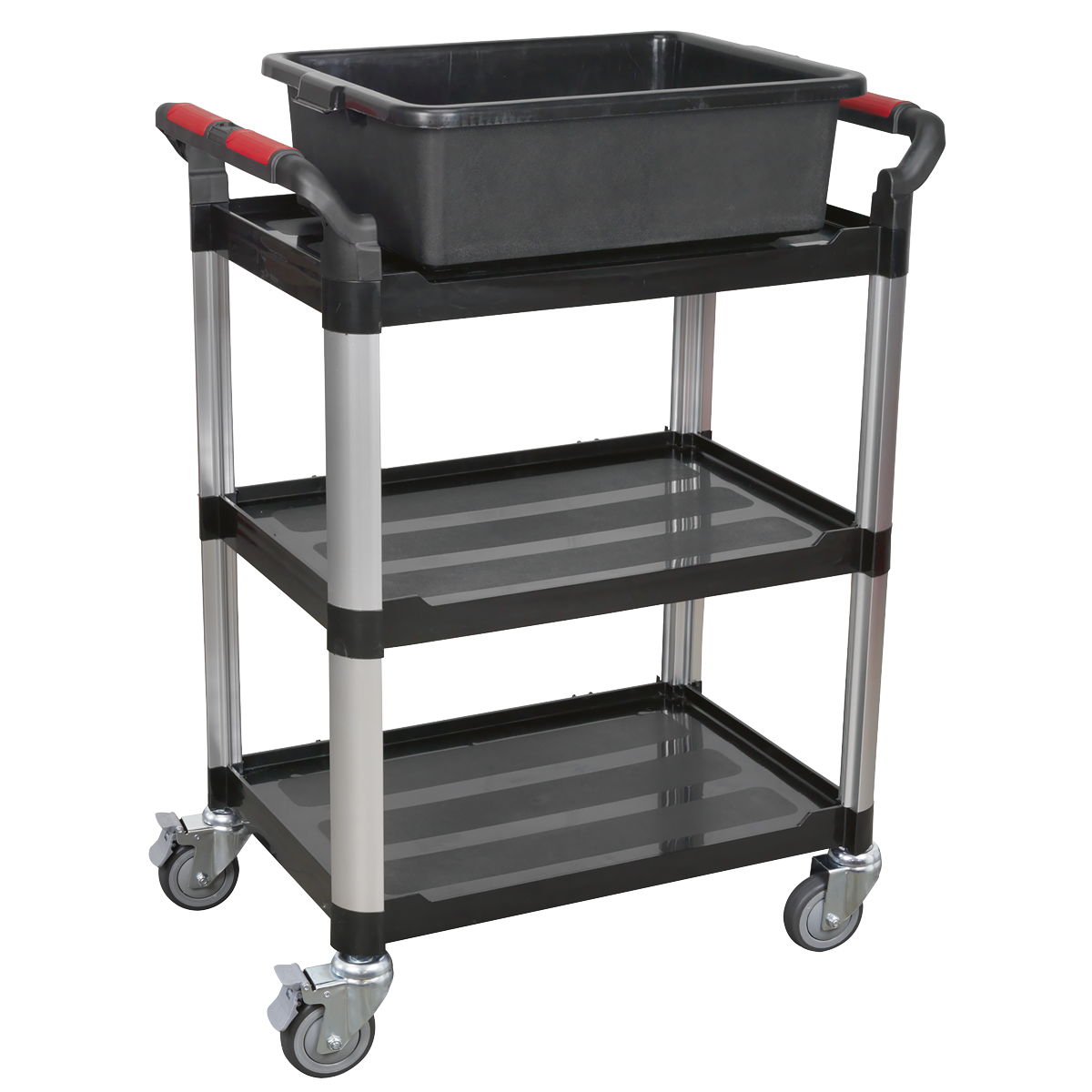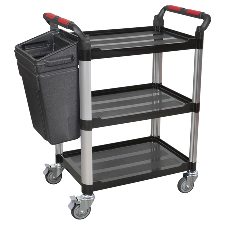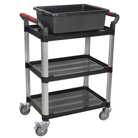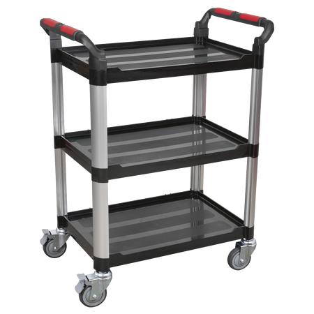 Composite garage workshop trolley with a 40kg capacity per shelf. Retention lips on only three sides of each shelf allow easy-access when adding or removing items. Four large castors, two locking. May also be used as a janitorial trolley.