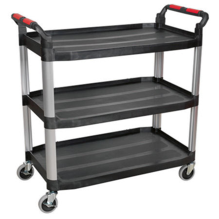 Composite garage workshop trolley with a 40kg capacity per shelf. Retention lips on only three sides of each shelf allow easy-access when adding or removing items. Four large castors, two locking. May also be used as a janitorial trolley.