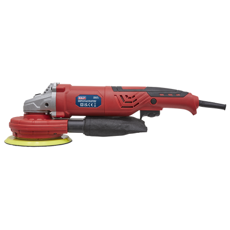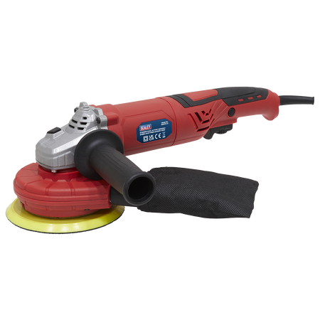 Features variable speed control ranging from 4000-7000rpm. Rotating self-contained dust extraction port with dust collection bag. Alloy bevel gear head with composite motor housing. Supplied with Ø150mm hook-and-loop backing pad and side handle.