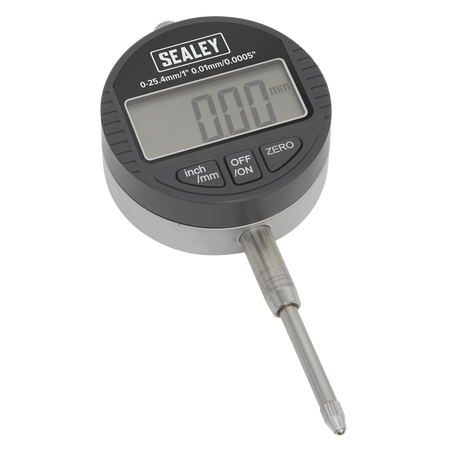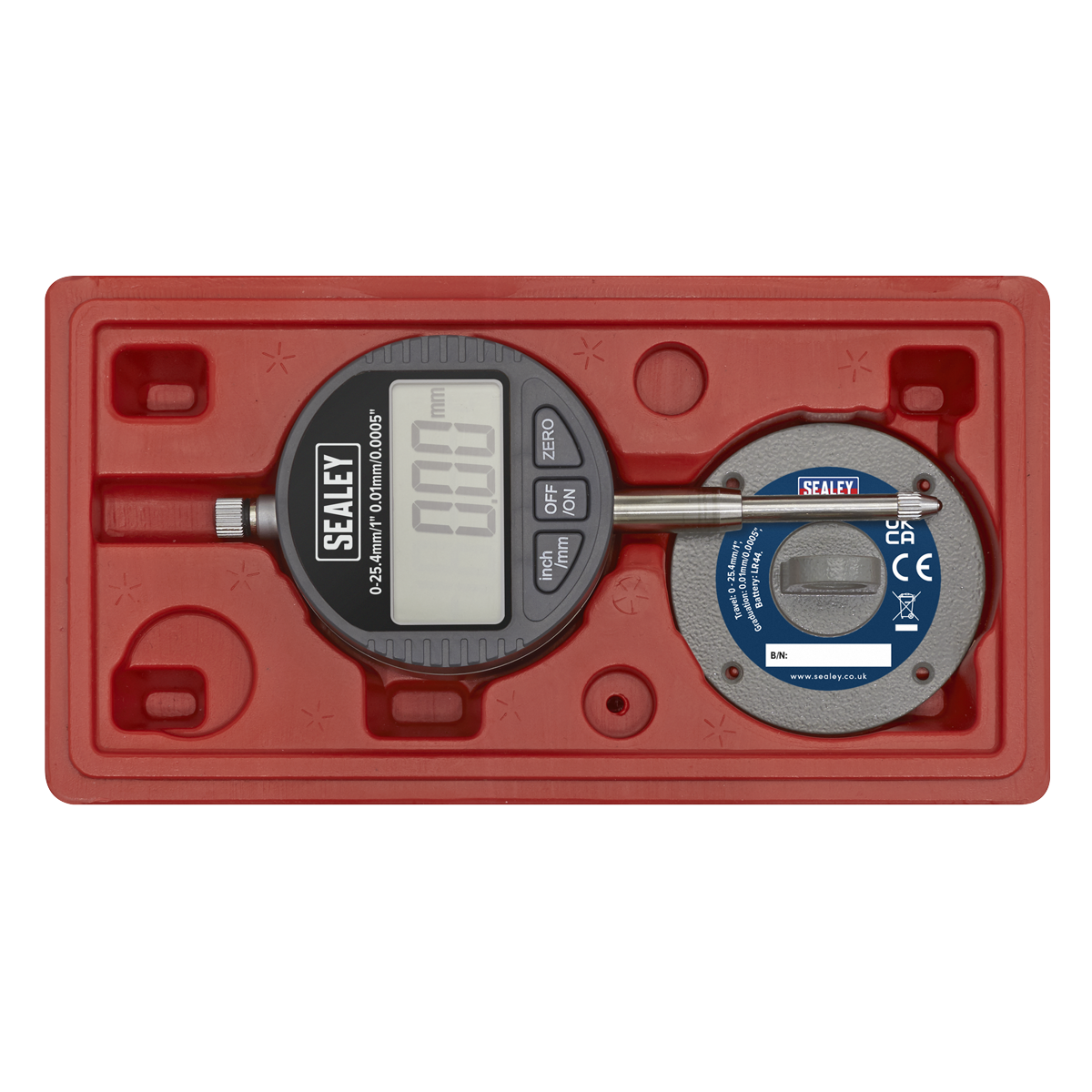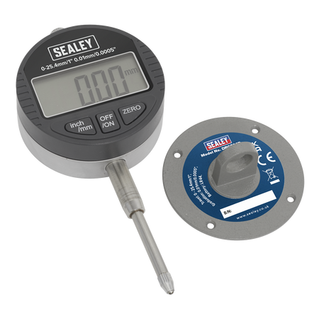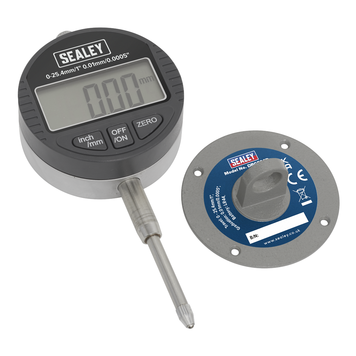 Suitable for use in precision engineering. Digital display shows both Metric and Imperial measurements. Measuring range between 0-25.4mm. Features lugged back plate for mounting on magnetic bases.