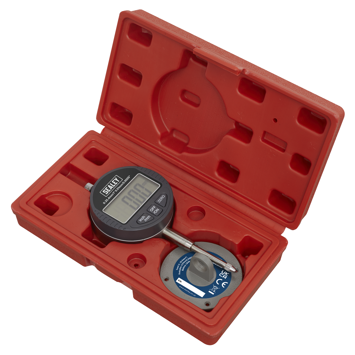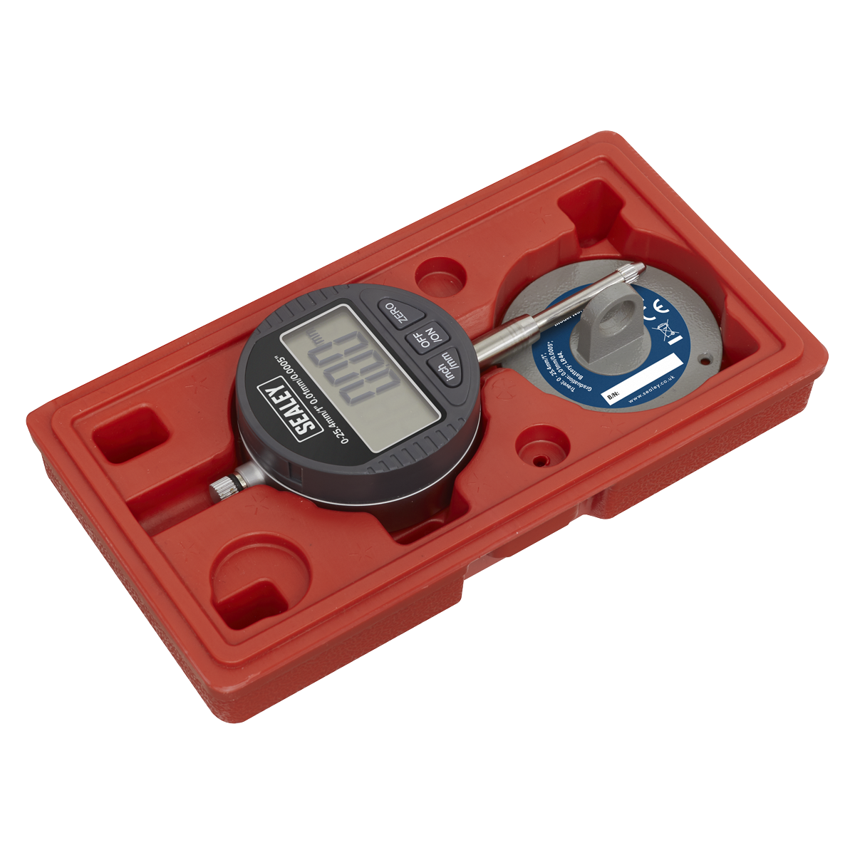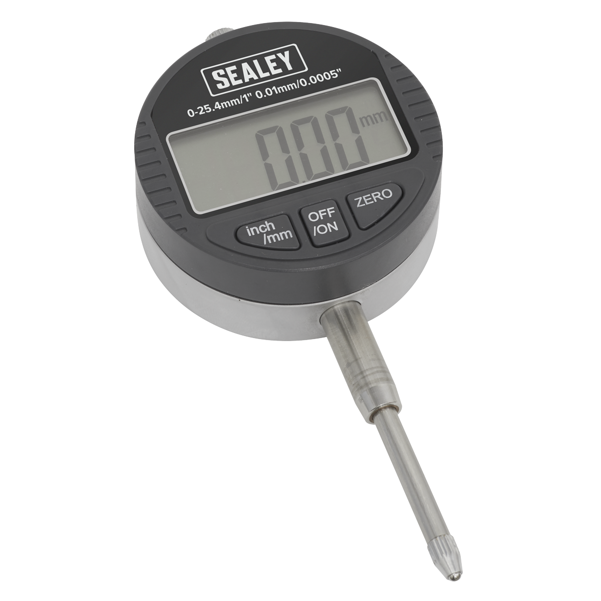 Suitable for use in precision engineering. Digital display shows both Metric and Imperial measurements. Measuring range between 0-25.4mm. Features lugged back plate for mounting on magnetic bases.