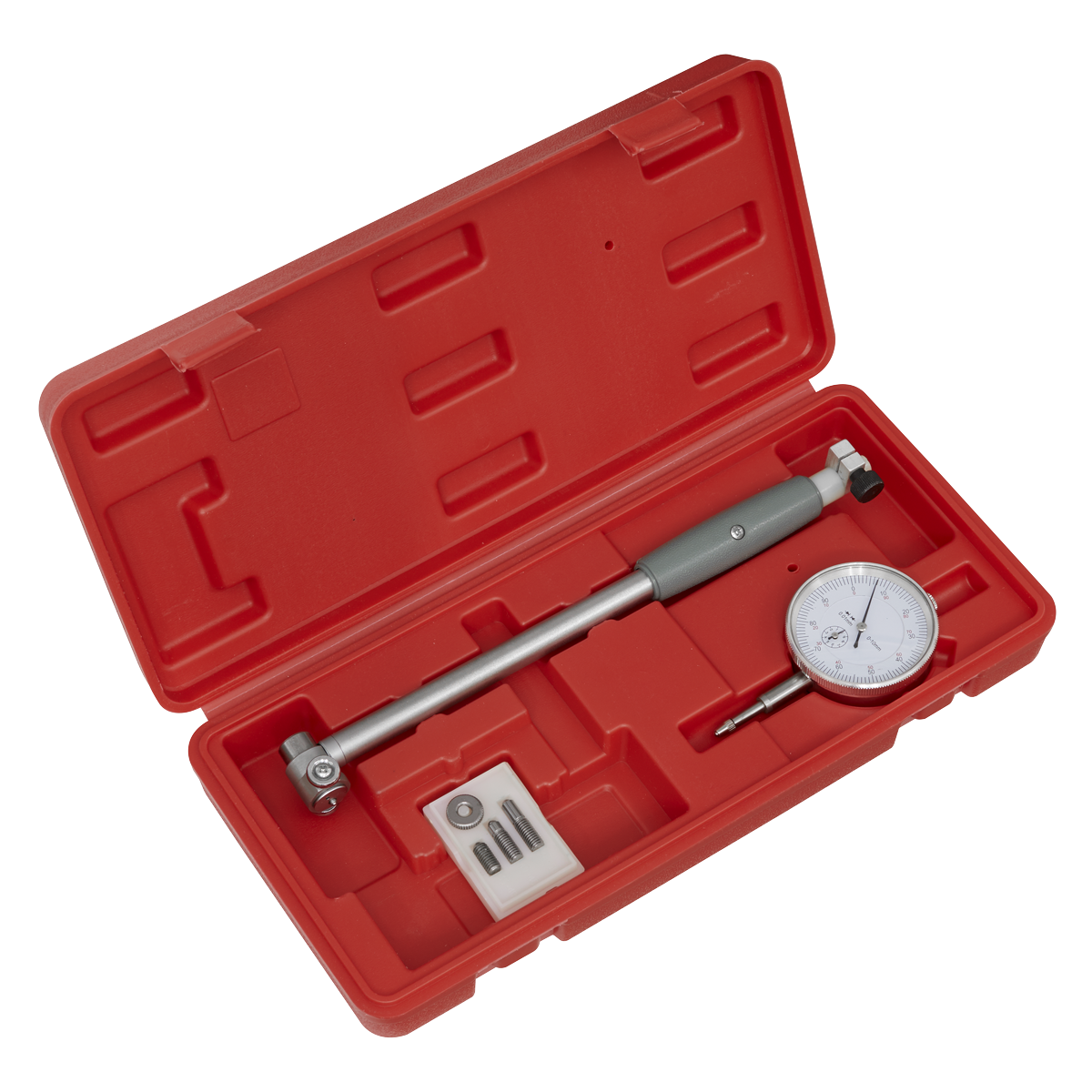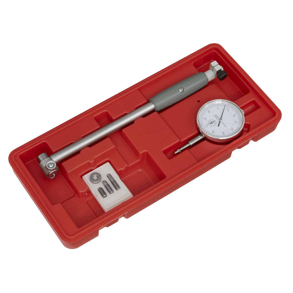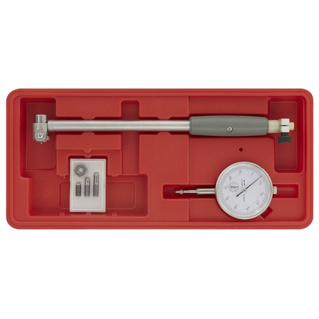 Precision mechanism with Ø58mm dial and locking rotating bezel, offering an accurate method of measuring a bore or detecting a taper or ovality. Will indicate the deviation from set size by up to 5mm with an accuracy of 0.01mm. Probe body, dial indicator, anvils and spacer rings are also included. Supplied in BMC.