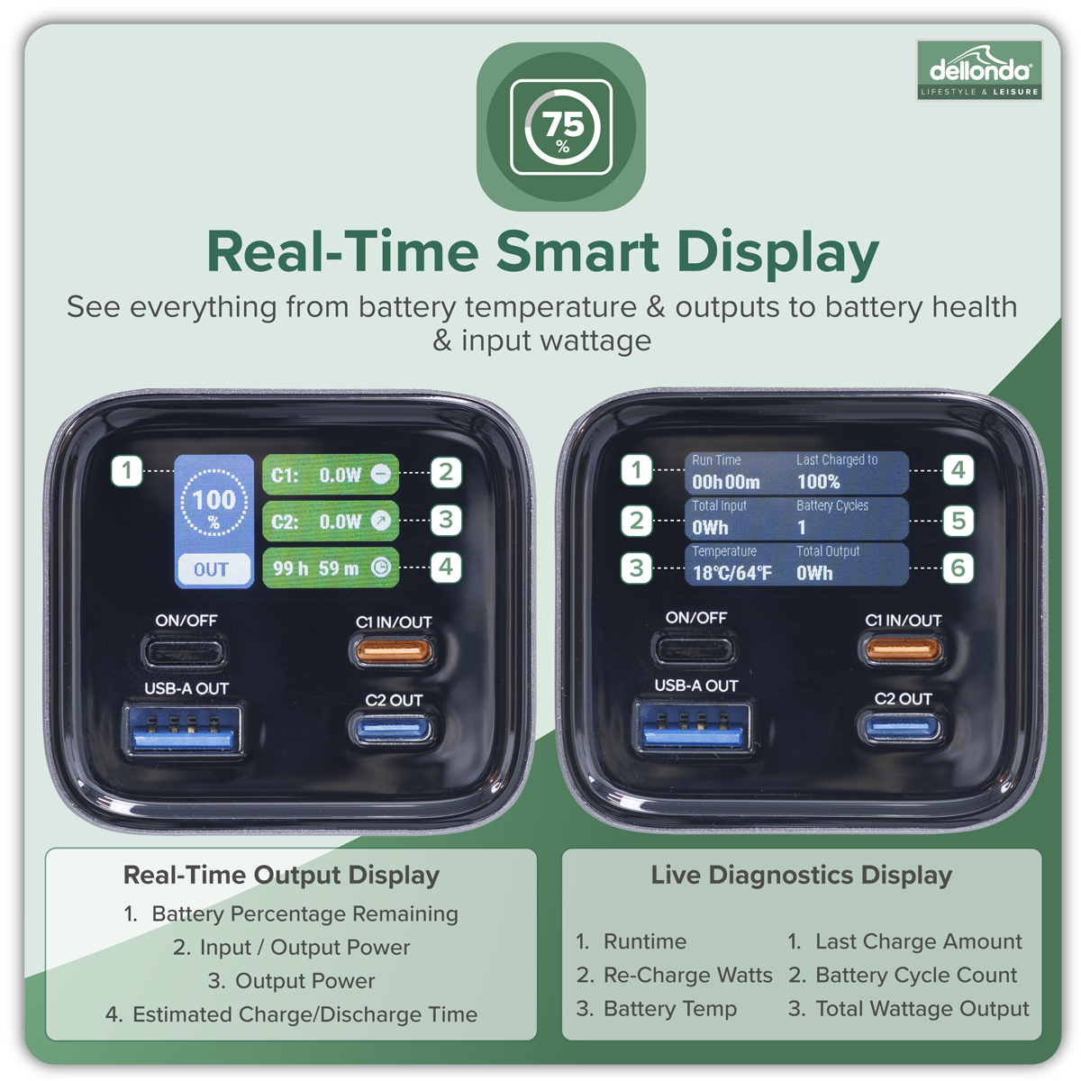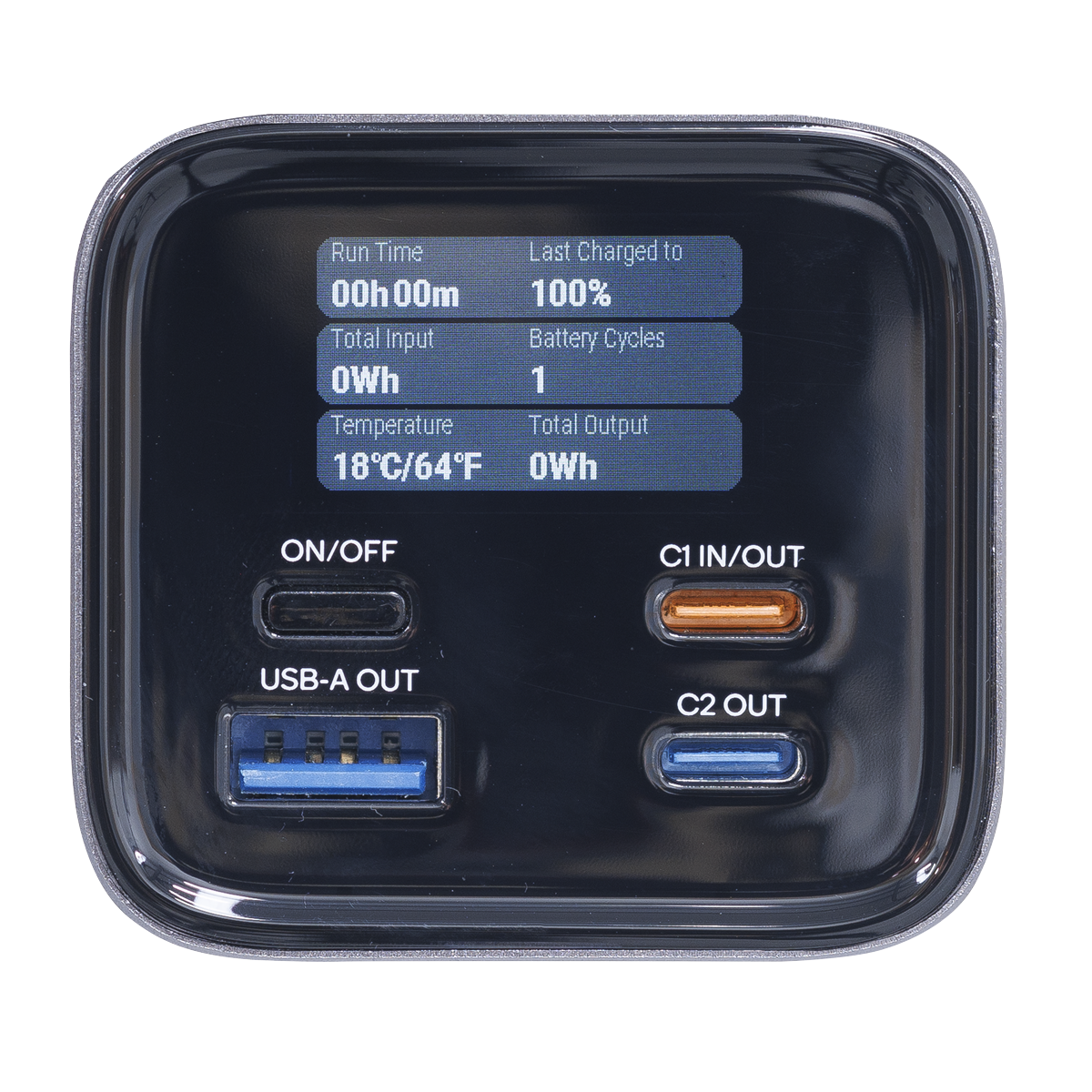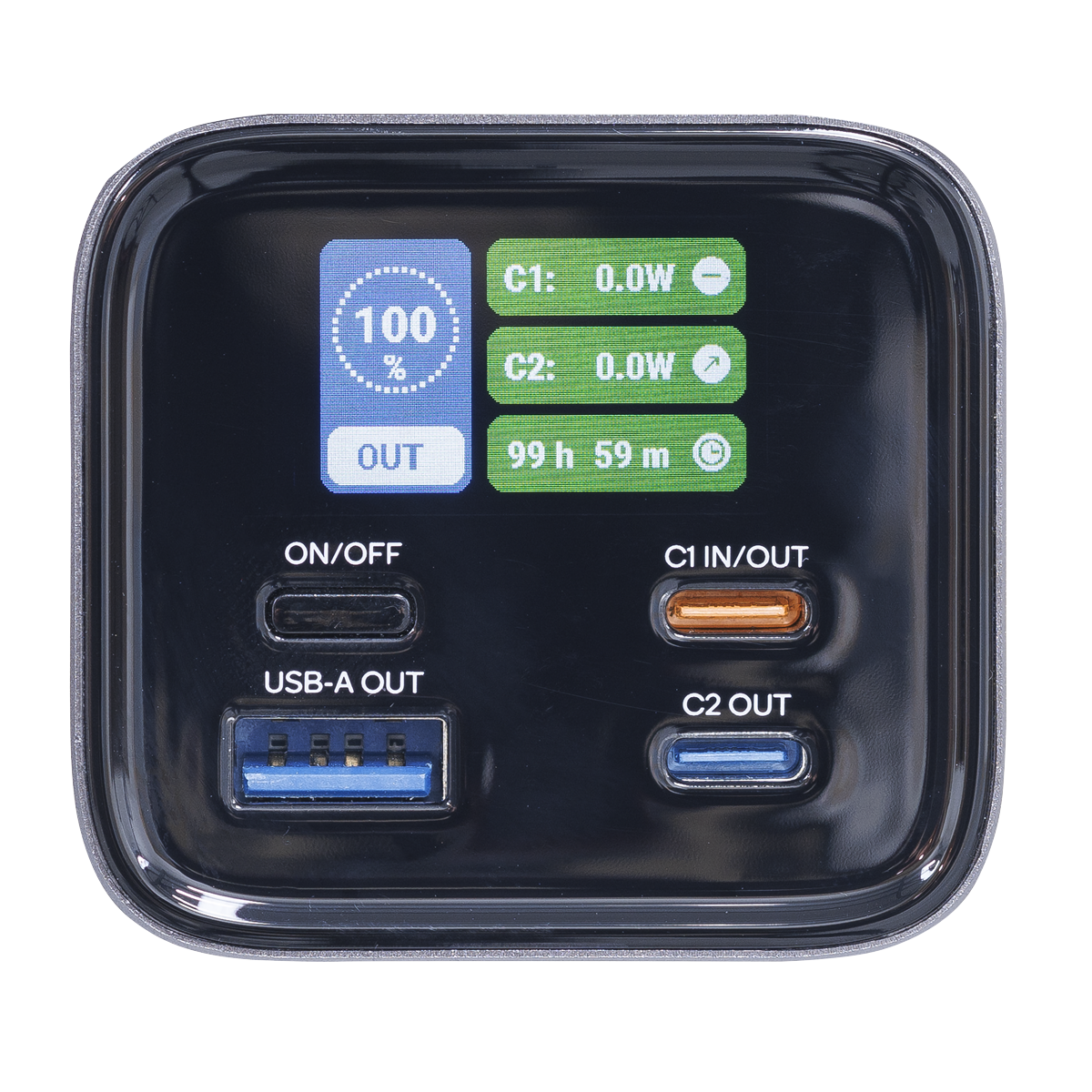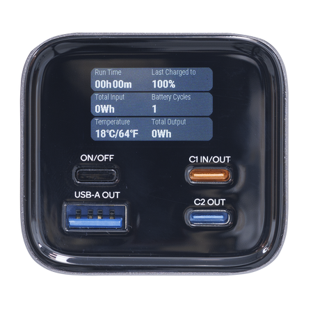 • SMART DISPLAY – Easy to read colour display shows current battery level, individual USB output usage, predicted charge time and other data.
