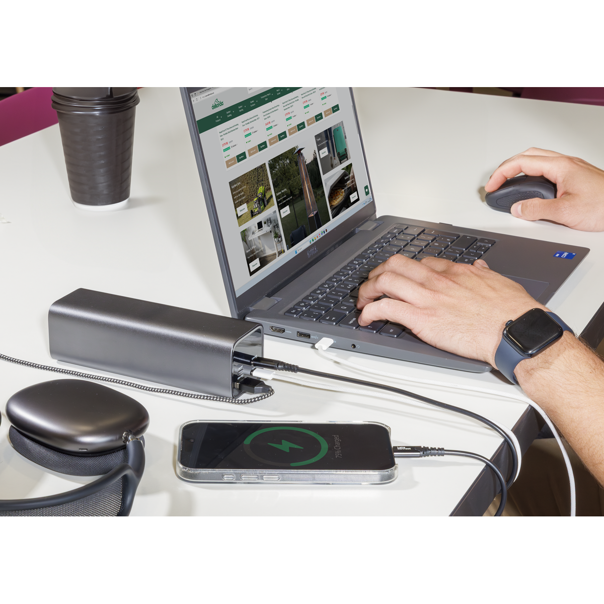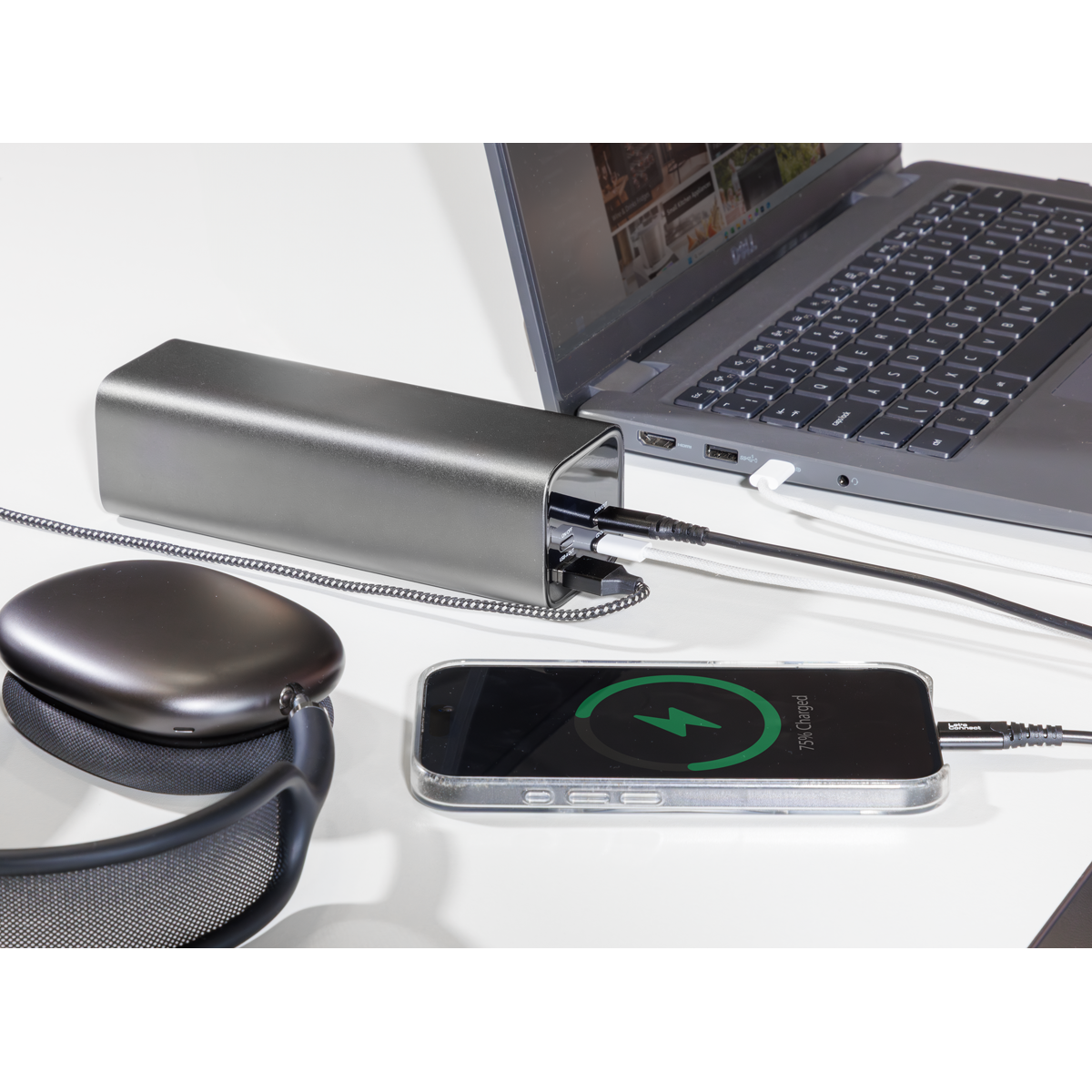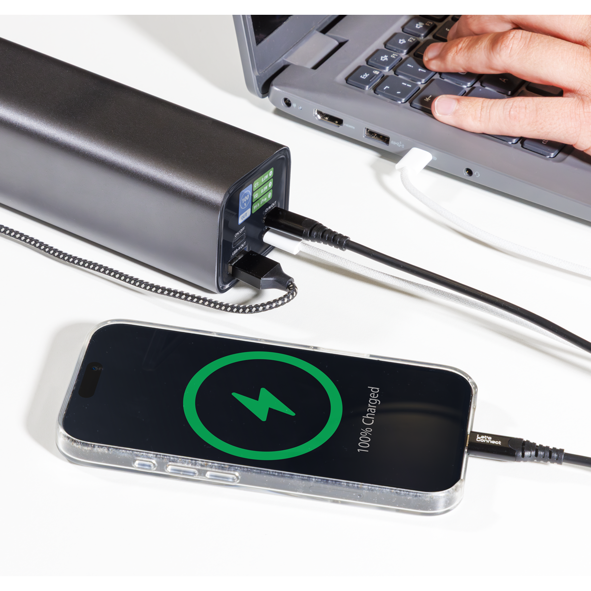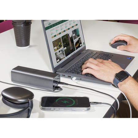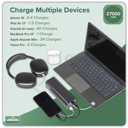 • HIGH CAPACITY – Features a 27000mAh battery capable of providing enough power to charge an iPhone 15 over 5 times, an iPad Air 13" over 1.5 times or providing a MacBook Pro 14" with 90% charge.