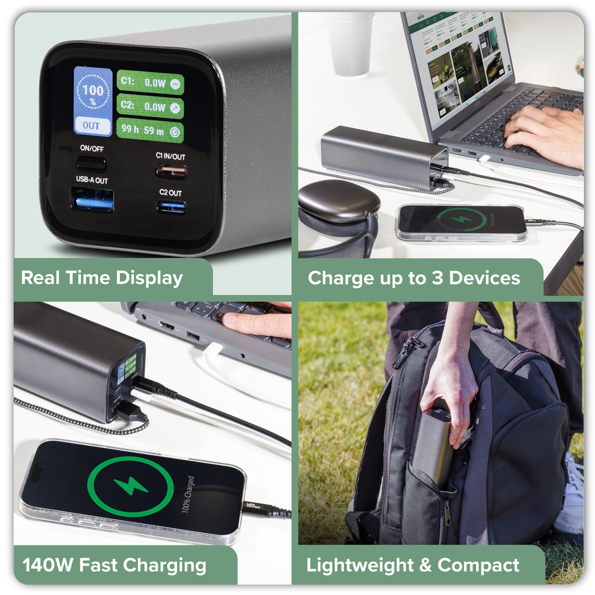 • USB-C PD3.1 – Utilises the latest PD3.1 technology with a maximum output of 140W. Also features a USB-C output and USB-A output capable of 20W and 18W charging respectively.