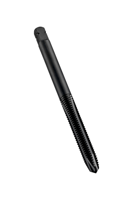 Spiral point tap with chamfer form B with a 3.5-5xP second lead, for ISO-Metric thread M10 with 1.50 mm pitch and 6H class of fit, dimensions according to ISO 529 standard with 10.0mm shank and 8.0mm square drive, powder metallurgical HSS-E with steam tempered surface finish for 2.5xD through hole threading in general purpose applications