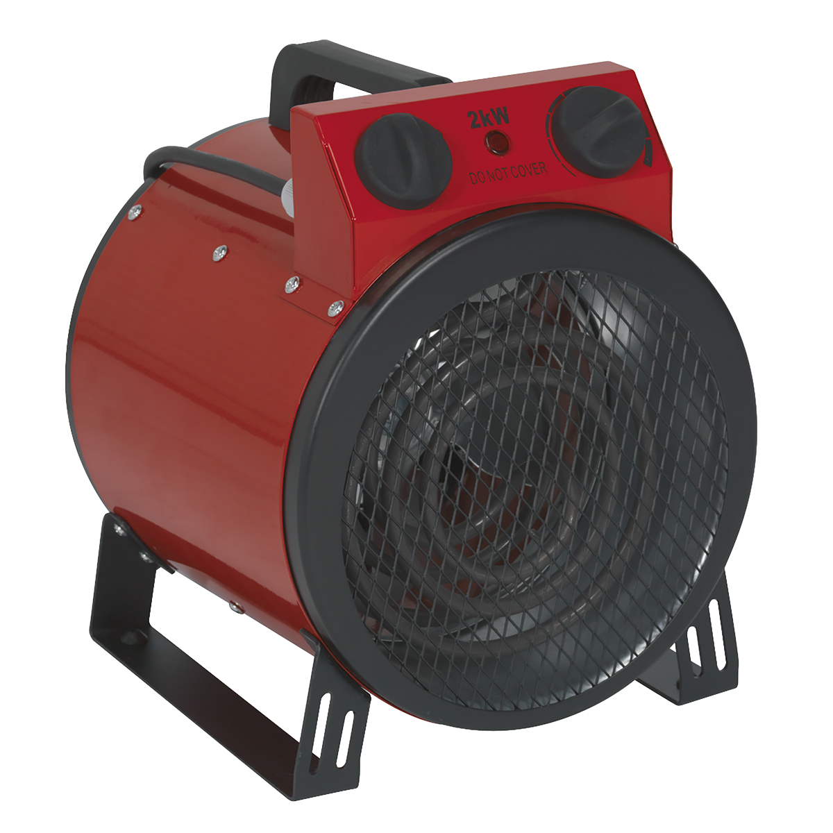 Electric fan heater for industrial applications. One heat setting with thermostat control, plus fan only. A totally dry heat with no condensation, no gas, no fumes and no smell. Ideal for workshops and garages. Supplied with power cable and 3-pin plug.