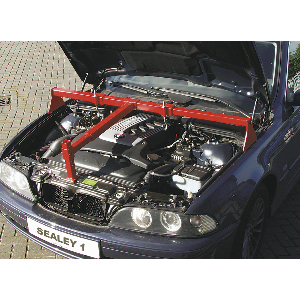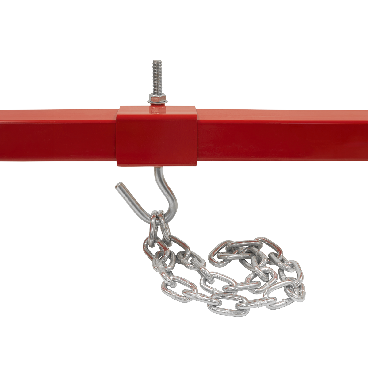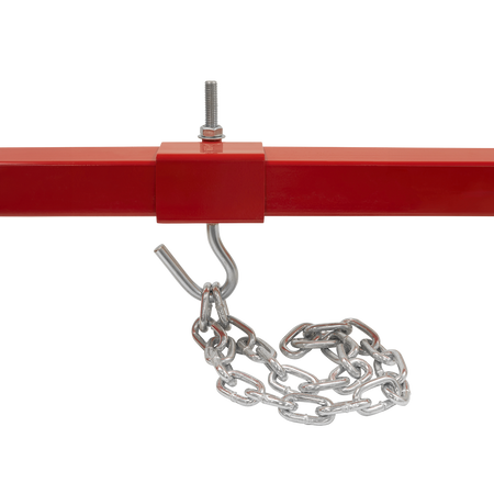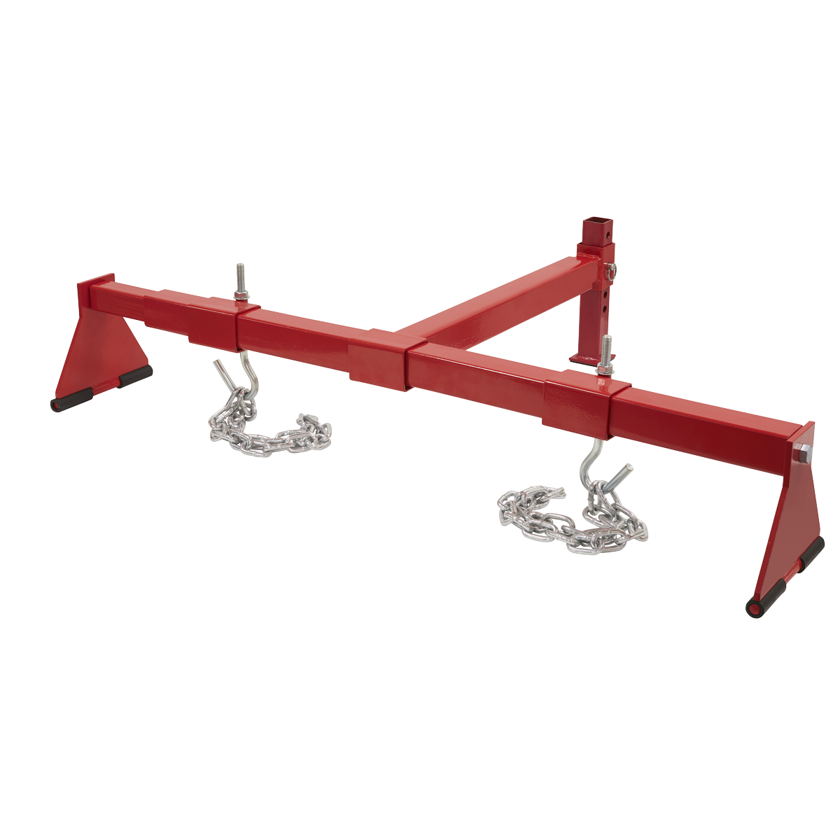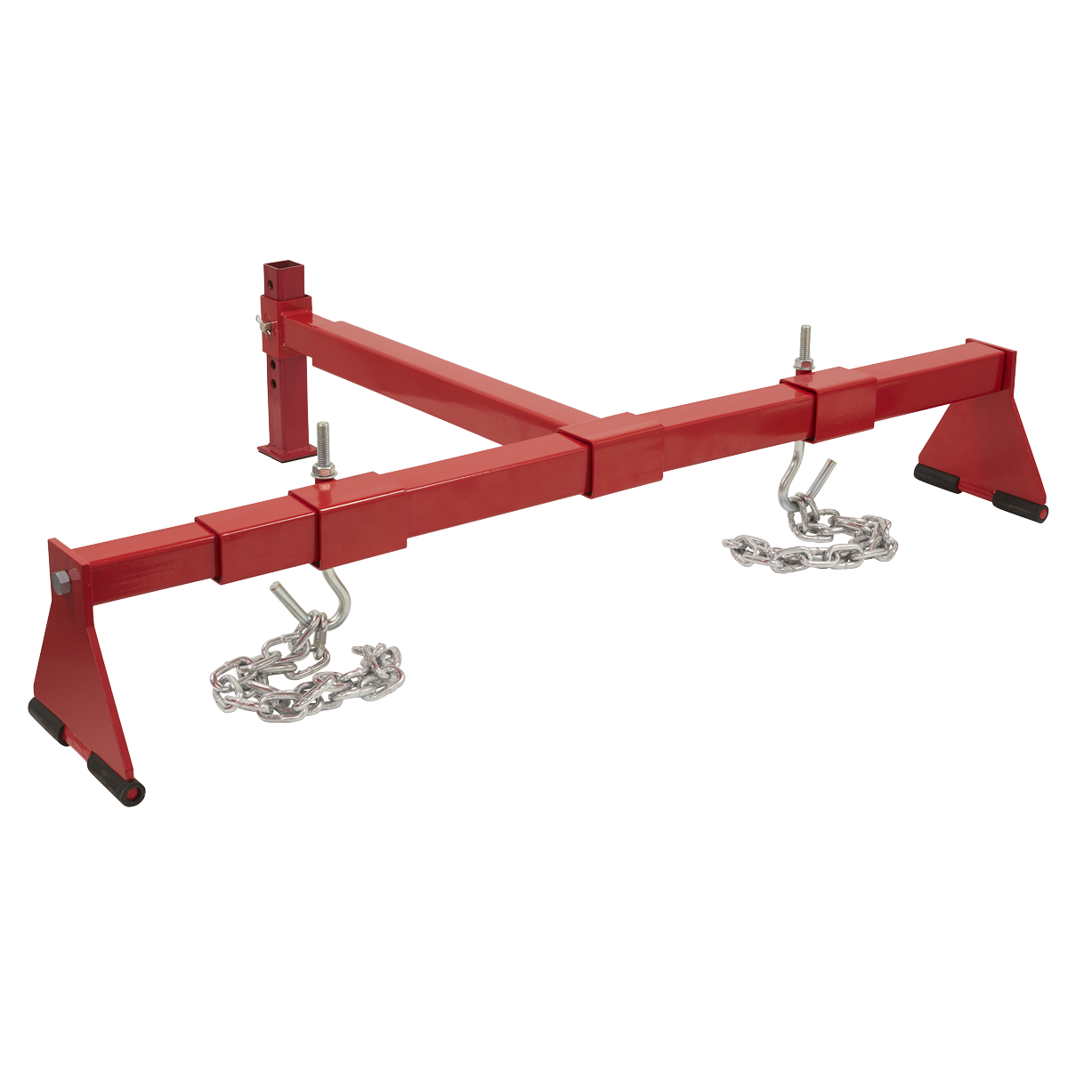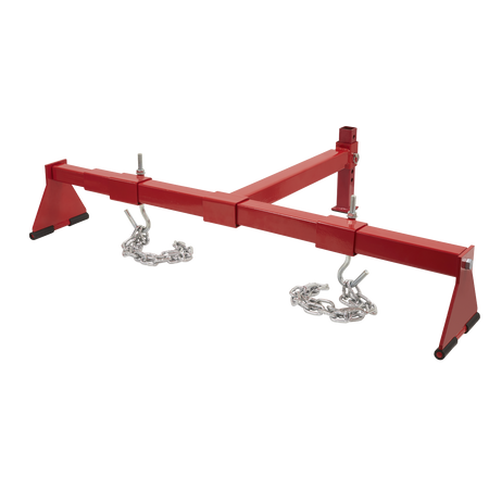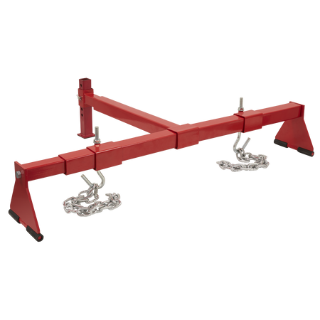 Suitable for heavy engines including 6-cylinder variants. Supports engine during maintenance operations including engine mounting replacement. Beam is supported on two rubber covered feet with third, height-adjustable foot, resting on the front of the vehicle. Supplied with two lengths of chain.